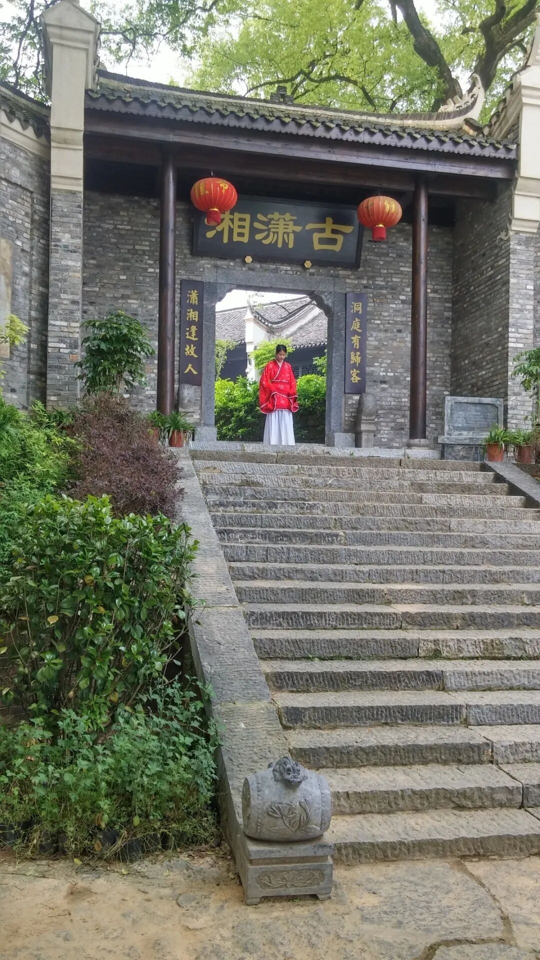说到潇湘,古人有无数的吟咏,我认为南朝柳恽的《江南曲》可能是最优美的。“汀洲采白蘋,日落江南春。洞庭有归客,潇湘逢故人。故人何不返,春华复应晚。”“洞庭有归客,潇湘逢故人”这两句后来被我挂到蘋洲书院山门两边对联上了。(丁国婧帮忙放一下蘋洲书院的山门。)