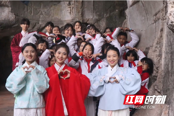 在为小学生们介绍朝阳岩的整体风貌时,侯永慧以及大学生助教们会一起背诵唐代柳宗元《游朝阳岩遂登西亭二十韵》诗中的名句:“高岩瞰清江,幽窟潜神蛟。开旷延阳景,回薄攒林梢。”用诗词的力量在小学生们心中埋下国学的读书种子;在实践环节,侯永慧又让小学生们来辨认摩崖石刻上的一个个汉字,讲解摩崖石刻的镌刻过程及其相关的历史名人故事,激发起了学生们无穷的兴趣,现场气氛异常活跃。杨梓塘小学负责人周云现场观摩后表示,永州摩崖石刻是中华历史与独特文化的浓缩,孩子们以听故事的形式学习摩崖石刻相关知识,感受摩崖石刻的魅力,在“读石”的过程中学习历史名人故事、识记古汉字,进而继承源远流长、博大精深的中华优秀传统文化,对小学生而言意义非凡。