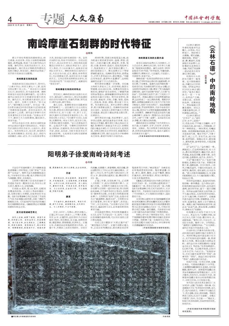 《中国社会科学报》“人文岭南”专版10月28日整版刊登了安博官网app国学院摩崖石刻研究团队的三篇文章,包括“摩崖碑拓”课程专任讲师敖炼的《南岭摩崖石刻群的时代特征》,图书馆副研究馆员李花蕾的《〈云林石谱〉中的南岭地貌》,国学院特聘教授、湖南图书馆研究馆员寻霖的《阳明弟子徐爱南岭诗刻考述》。《南岭摩崖石刻群的时代特征》概括介绍了南岭摩崖石刻的起源、时间特点、主题内涵。《〈云林石谱〉中的南岭地貌》介绍了宋代杜绾的《云林石谱》及其亲笔题名。《阳明弟子徐爱南岭诗刻考述》考证了徐爱在月岩的三幅诗刻及其创作背景。三篇文章归纳了南岭摩崖的水石奇观特点,是首次面向读者系统推广南岭摩崖石刻的学术性文章。
