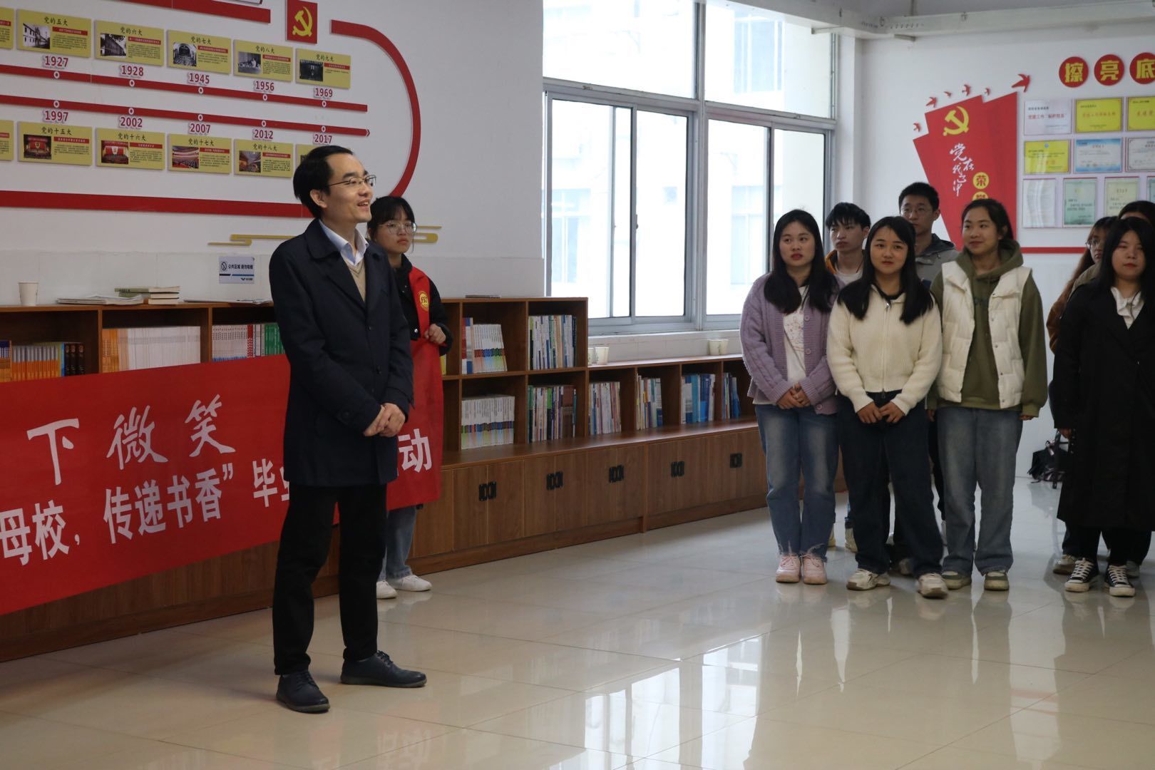 本网讯 刘乐)今年是毛泽东等老一辈革命家为雷锋同志题词60周年。60年来,雷锋精神深入人心,在全国上下蔚然成风。为深入学习贯彻党的二十大精神,贯彻落实习近平总书记关于弘扬雷锋精神的重要指示精神在我校“传承雷锋精神,培育时代新人”活动月开展之际,化学与生物工程学院在逸夫楼4楼读书角组织开展了“情系母校、传递书香”毕业生捐书活动。学院院长覃佐东、副院长尹业师、党总支副书记基艳、化生院全体辅导员、19级捐书毕业生及志愿者等成员参加了此次活动。