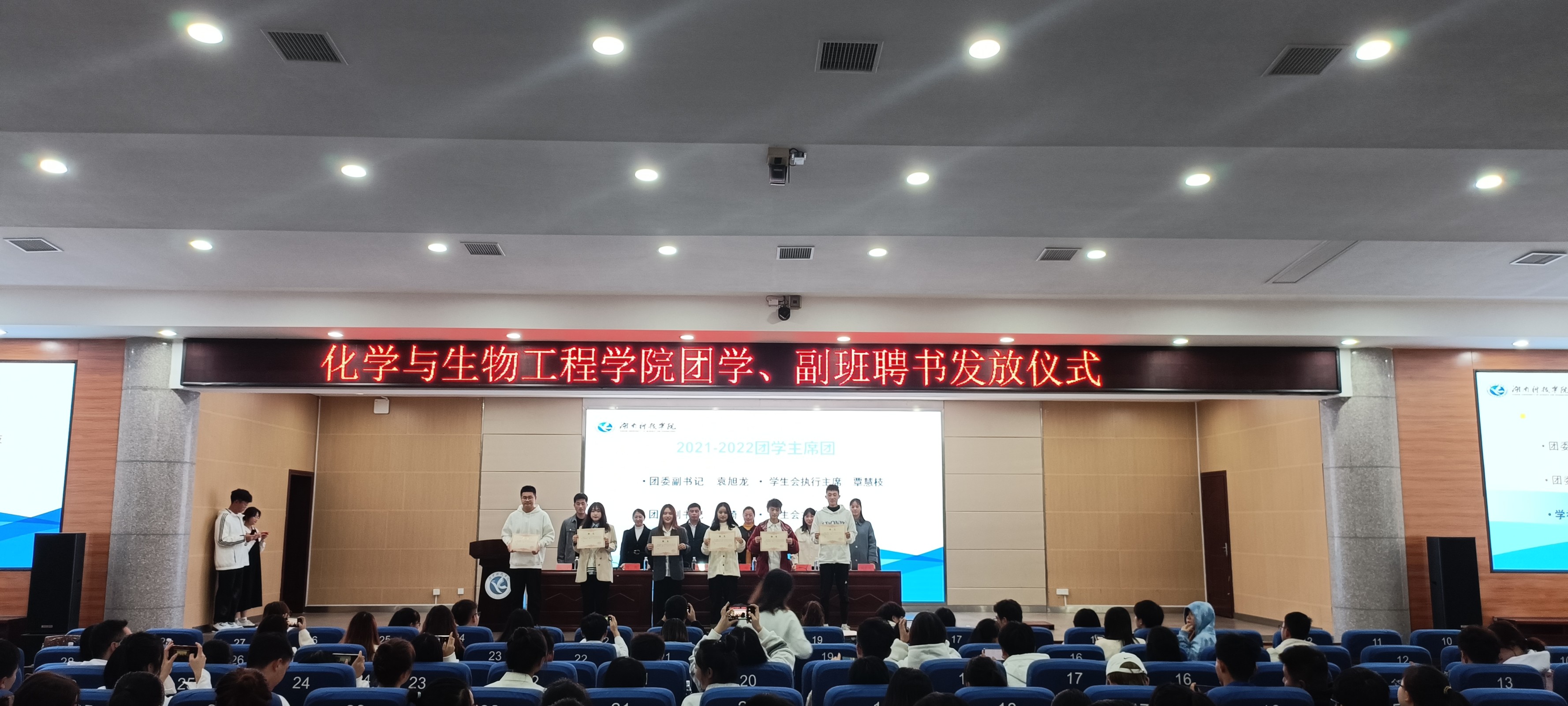 本网讯(通讯员 肖佳婧)1021日晚,化学与生物工程学院在潇湘大讲堂举办2020-2022年度团学干部及副班聘书的颁发仪式。党总支副书记任学兵、各级辅导员、大一大二全体学生参加活动。