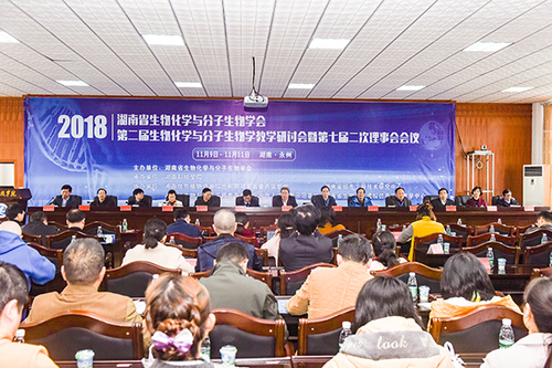 本网讯  11月10日上午,湖南省生物化学与分子生物学会第二届生物化学与分子生物学教学研讨会暨第七届二次理事会在学校召开。本次会议以“以本为本,推动生化与分子生物学课堂革命”为主题,由湖南省生物化学与分子生物学会主办,我校承办,学会理事长胡维新、名誉理事长梁宋平及来自全省的60余名专家学者参会。校长曾宝成参加开幕式并致辞。