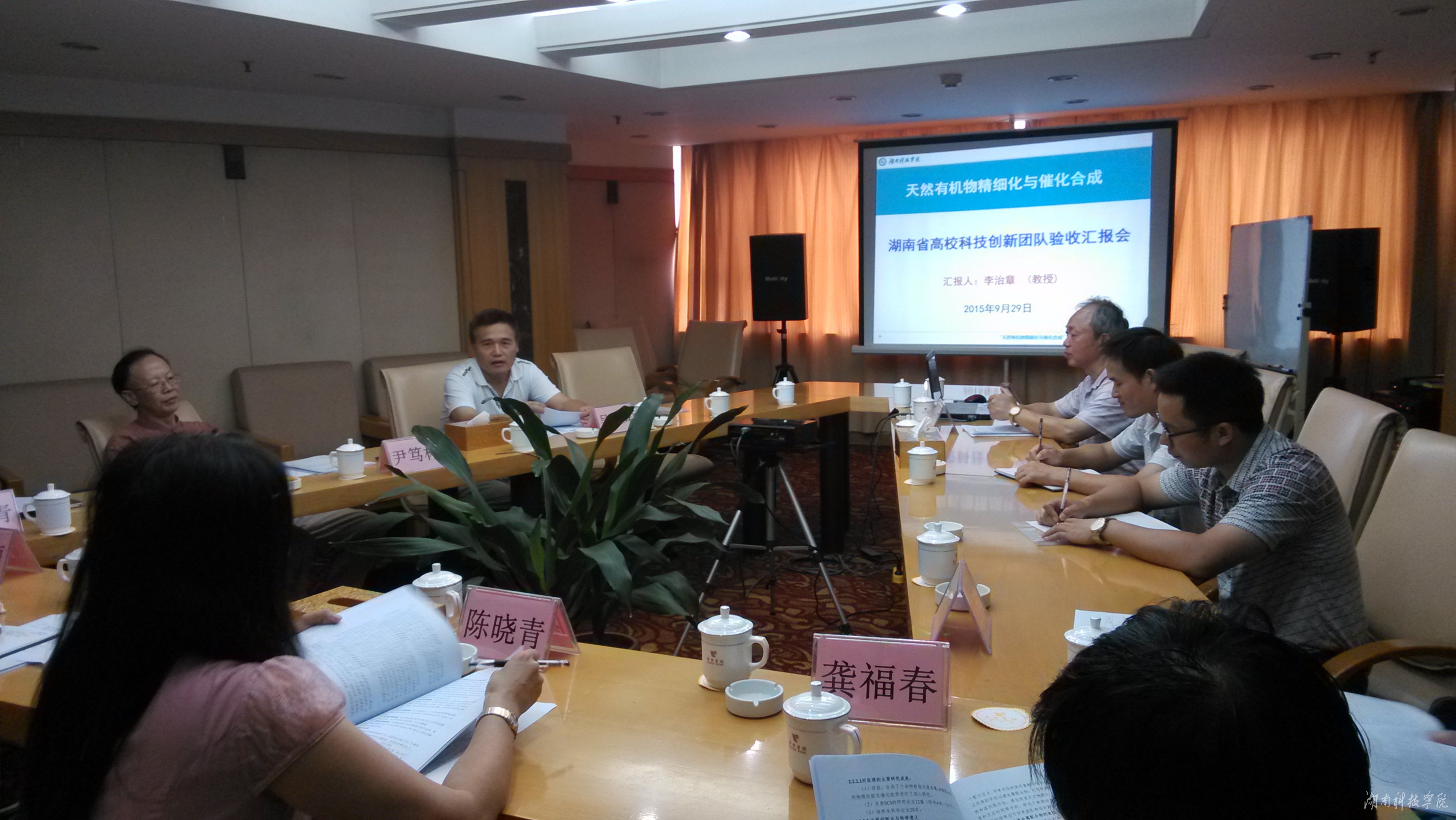 此次共有来自中南大学、湖南大学、湖南师范大学等高校的7名知名专家对我校“天然有机物精细化与催化合成”湖南省高校科技创新团队进行检查验收。验收会上,团队带头人李治章教授从团队取得的标志性成果、团队创新能力建设情况、学科建设与人才培养、团队特色、经费使用情况等5个方面向专家组汇报了团队所取得的成果。专家组在认真听取汇报,审阅相关资料,经质疑答辩和讨论后,一致同意我校该团队通过考核验收,评议结果为优秀。