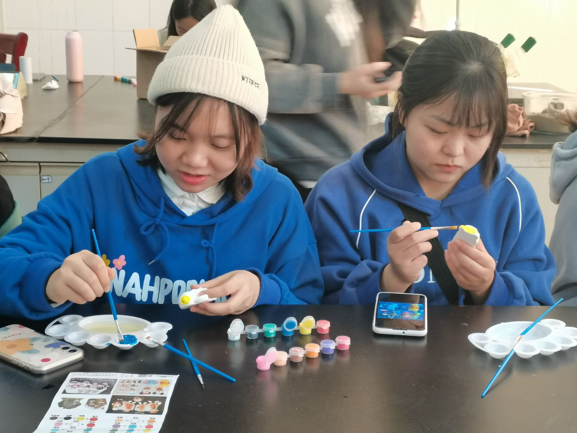 为了更好的开展活动,活动开始前,科普协会相关人员在实验桌上准备好此次活动所需材料。随后大家首先挑选自己喜欢的石膏娃娃,两两组合共用一套工具对石膏娃娃进行上色。