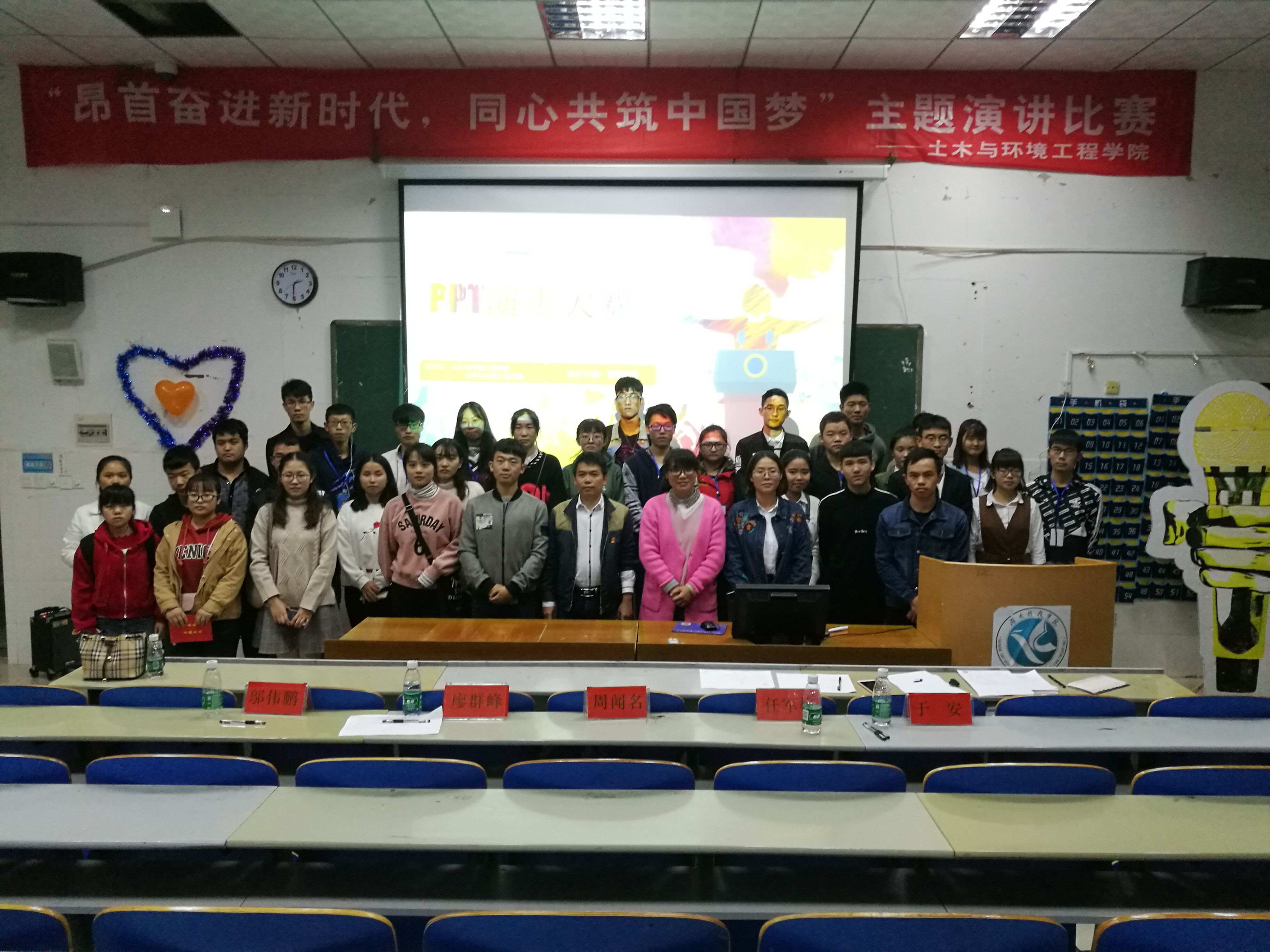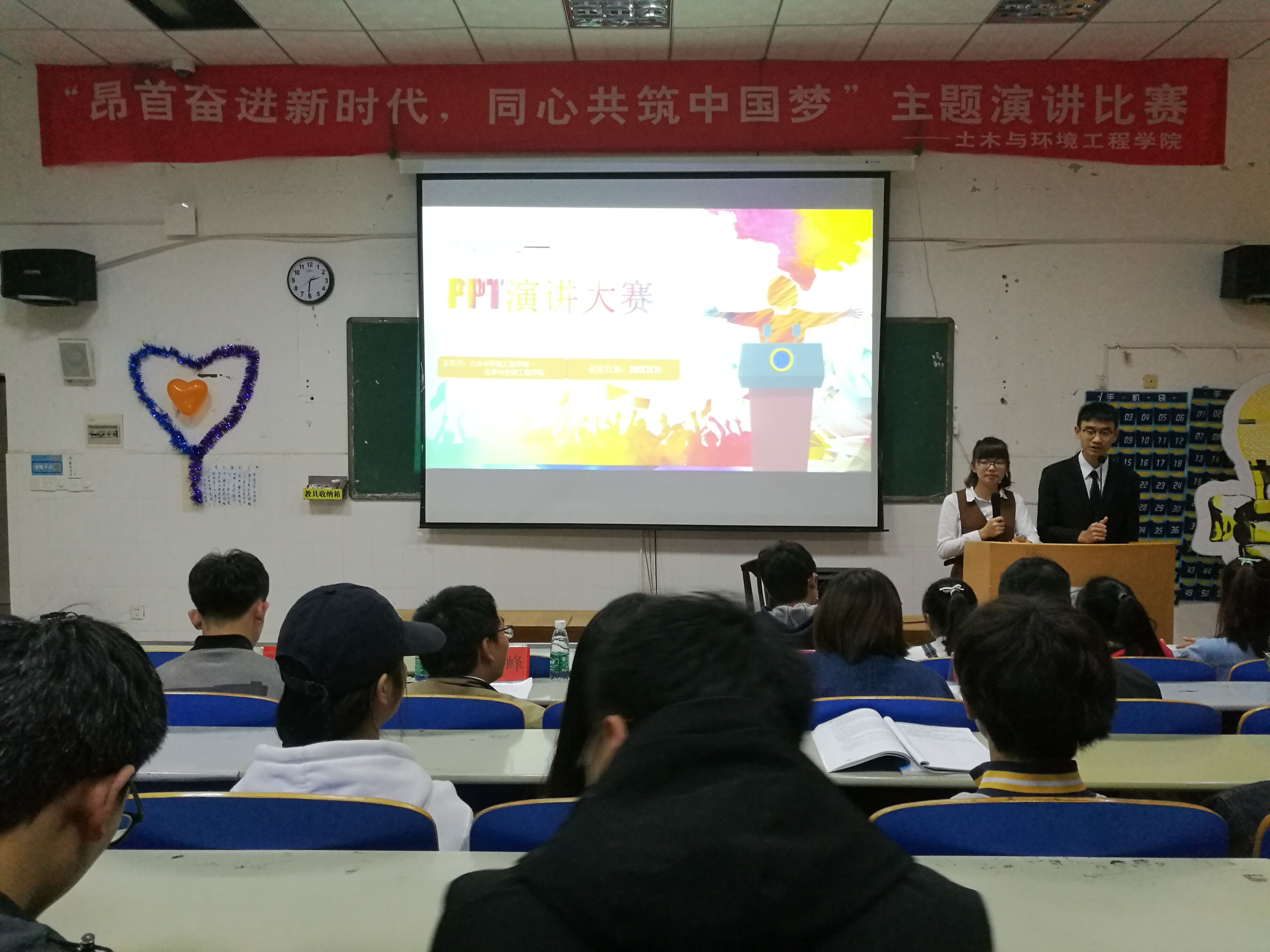 本网讯(通讯员 黎嘉俊 唐婉婷)11月11日下午3点50分,由化学与生物学院和土木与环境学院共同举办的以“智慧班集体,魅力湘科院”为主题的PPT演讲大赛于逸夫楼201火热开展。我院分团委书记周闻名、学生会主席任军梅、学生会副主席于安出席本次活动。
