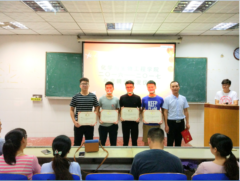 本网讯(通讯员 万灵)627日上午,化学与生物工程学院工程学院于逸夫楼218隆重举行了二〇一六到二〇一七年度学生干部聘书颁发仪式,为辛苦工作了一年的团学学生干部、辩论队队员、大一各班副班主任颁发聘书。院党总支副书记曾二青、分团委书记周闻名、各年级辅导员出席本次仪式。