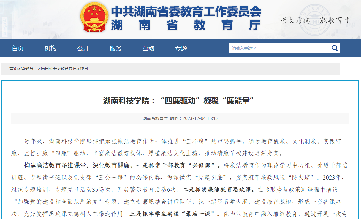 打造廉洁文化矩形阵地,深化文化润廉。一是融入校园环境。加强廉洁文化景观建设,美化了爱莲湖,兴建了廉洁文化长廊,设立了一批楼道廉洁文化宣传牌,让廉政文化景观“出门可见、随处有影”。二是融入校园文化。通过倡导《安博官网app清廉公约》,推广使用电脑廉桌面,摆放岗位廉洁风险警示桌牌,定期开展廉洁微党课、廉洁作品创作、廉洁知识抢答赛等丰富多彩的廉洁文化进校园活动,以及在电子显示屏滚动开设“今日说廉”专栏,在“清廉湘科院”微信公众号发布微电影、小故事、廉洁寄语、漫画说纪等新媒体作品,让党员干部在“实景”“实境”中接受教育。三是融入地方资源。依托学校现有湖南省舜文化研究基地、濂溪学研究基地等平台,充分挖掘运用永州红色教育资源和地方优秀传统文化,立项省级以上廉洁教育研究课题2项,不断在传承地方文化中涵养清风正气。四是融入校地合作。与永州市纪委监委、永州市教育局共同探索推进大中小学廉洁教育一体化,组织专家团队为本地5000余名大中小学生宣讲周敦颐廉洁思想,实现廉洁教育资源共建共享。指导乡村振兴帮扶点江永县邑口村将清廉文化融入清廉村居建设,成功创建“永州市清廉乡村建设示范点”。
