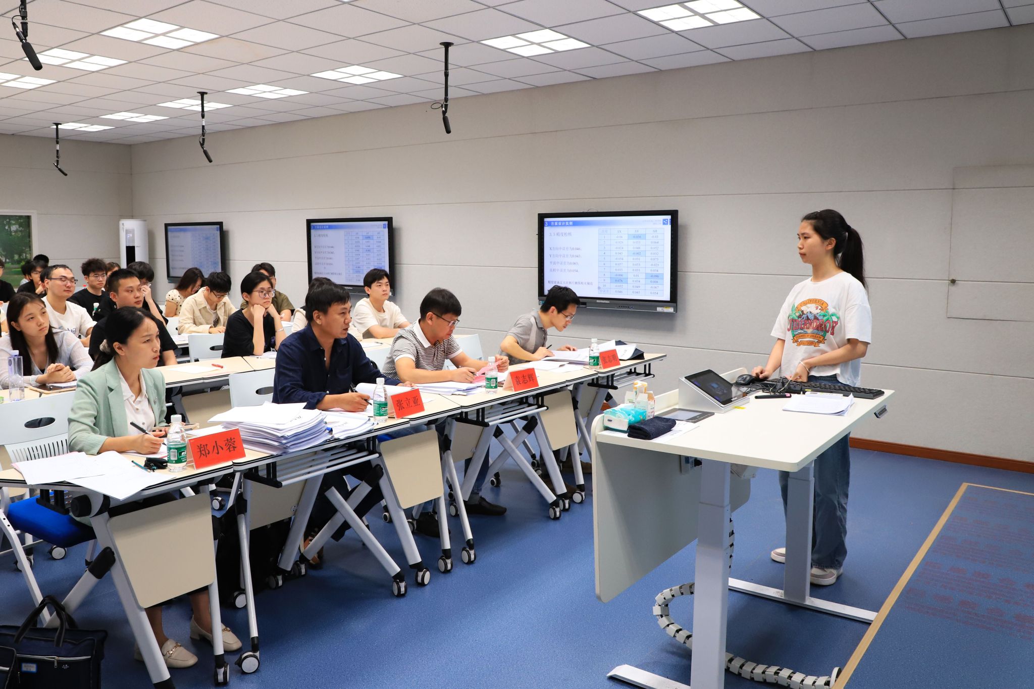 2024年本科毕业论文(设计)校级答辩按专业类别分为五组进行,聘请了校内外15名专家严格把关,随机抽取14个专业共150名毕业生进行现场答辩。答辩工作包括专家评阅论文、毕业生PPT汇报、现场答辩等三个步骤,整个答辩过程严谨有序、讨论热烈、氛围融洽。