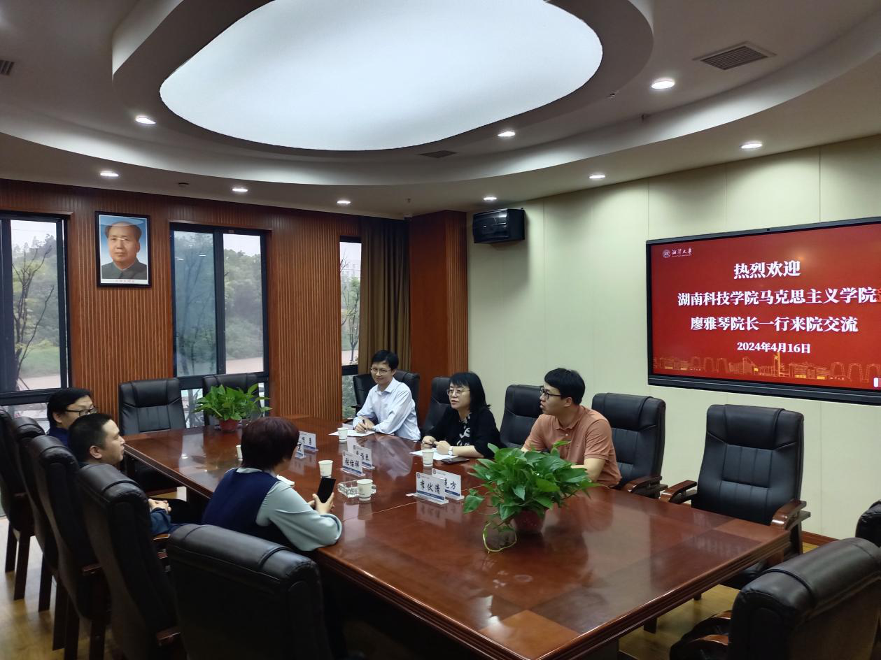 (本网讯 周勇)2024年4月16日,为加强湖南省重点马克思主义学院建设和思想政治理论课建设,并调研教学领域设备更新相关项目建设,学校学术委员会主任唐艳明、马克思主义学院院长廖雅琴率队先后赴湖南商务职业技术学院马克思主义学院、湘潭大学马克思主义学院考察学习。