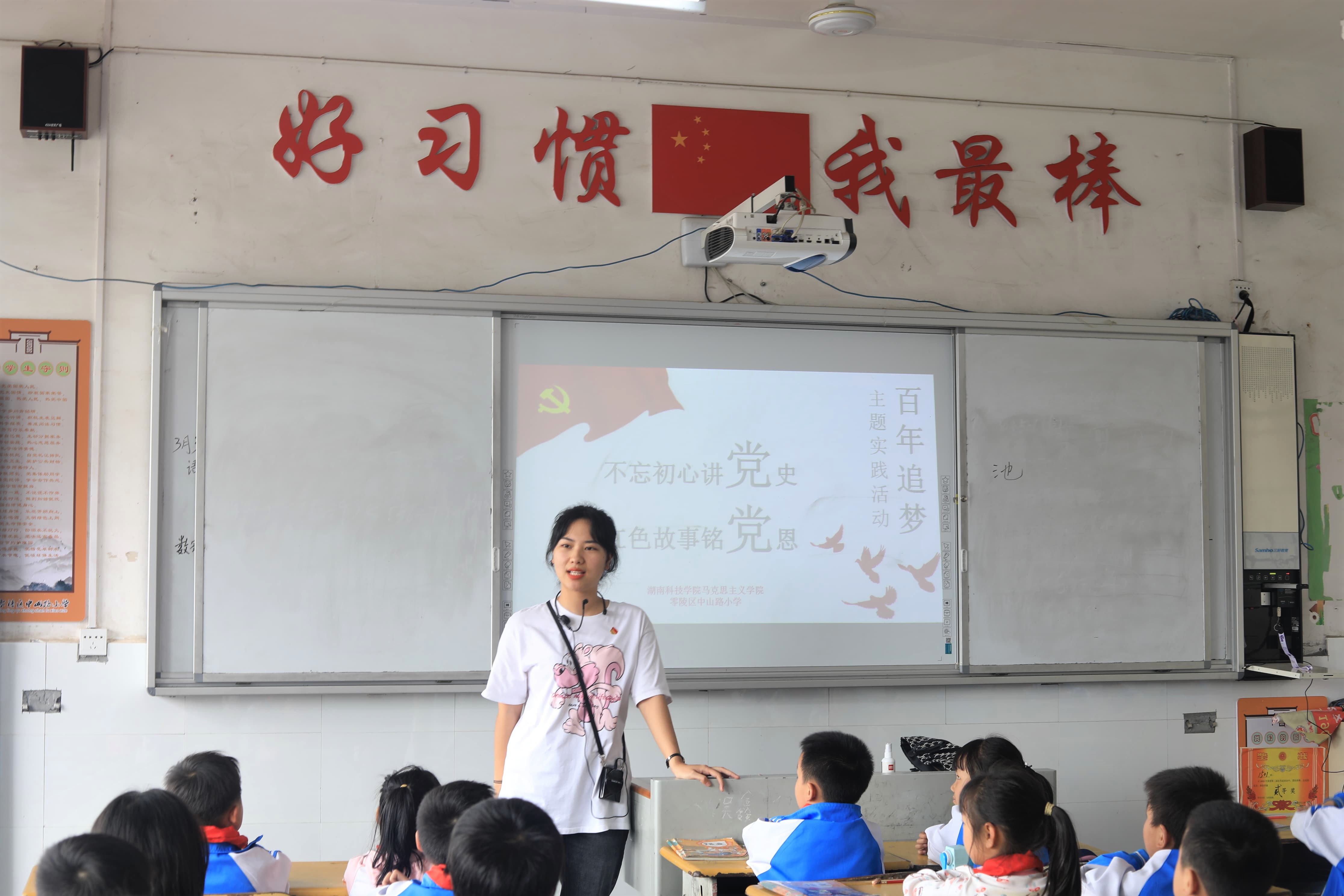 “红船起航南湖里,鲜红党旗高举起。”在二年级一班,志愿者池鹏以党的一大为历史背景,用极富童趣的语言,生动地向同学们讲述了一只小船和一个大党的故事,将那一段可歌可泣的历史以一种浅显易懂的形式展现在同学们眼前。课上,同学们在简单的顺口溜里体会到,党诞生的小船很小,但她的作为和成就是极其伟大的,深深激发了同学们的敬党、亲党、爱党情怀。