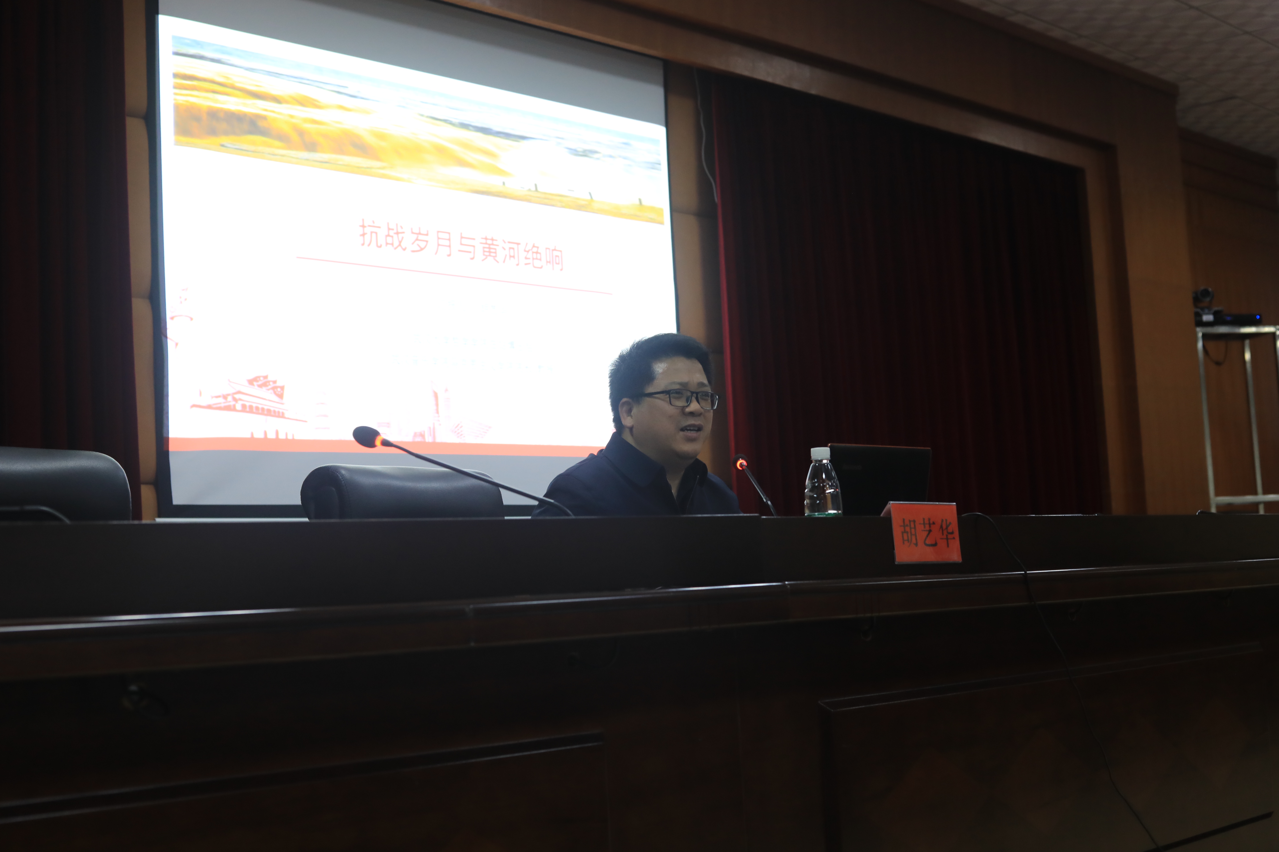本网讯(通讯员吴祖琳)4月1日晚,武汉音乐学院马克思主义学院院长胡艺华教授,应邀在我校行政楼八楼一会议室作题为《抗战岁月与黄河绝响》的学术讲座,讲座由马克思主义学院院长廖雅琴主持,马克思主义学院及音舞学院共计百余名师生参加。