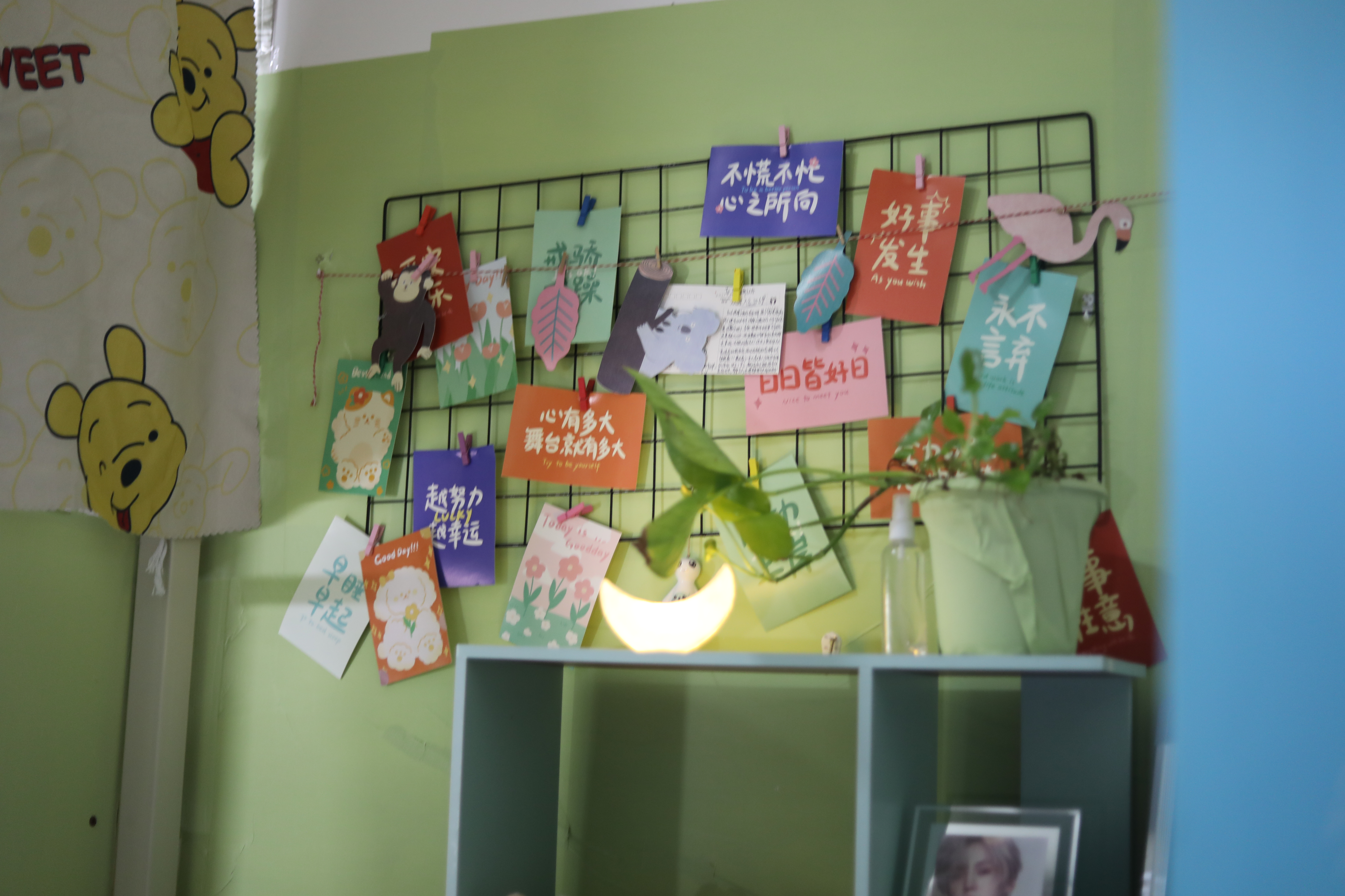 有的宿舍将照片装饰在墙壁上,用灯光点亮珍贵回忆;有的宿舍以动画元素结合撞色创意综合运用,构成温馨舒适的宿舍一角;有的宿舍在门前装饰可爱挂件,童趣与活力萦绕在眼前与心间。