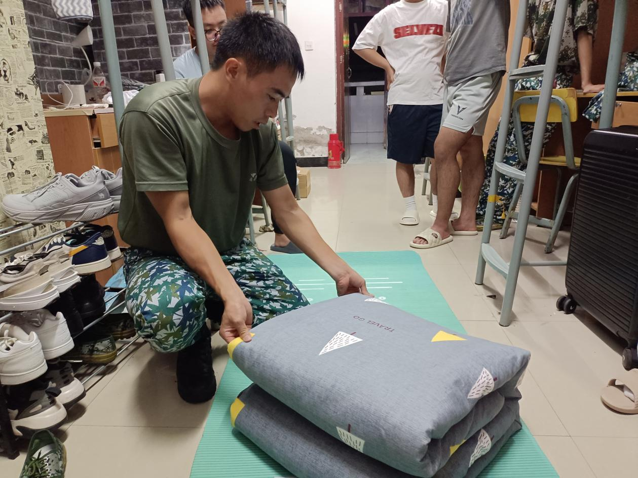 当日晚,为帮助新生军训期间更快速树立纪律意识,我院开展内务整理活动。教官进入宿舍对内务进行检查和指导,详细讲解并示范床铺整理、物品摆放方法后,说明了宿舍卫生环境的合格标准,要求内务不合格的宿舍进行整改。同学们听取教官指导,努力清扫后,宿舍面貌焕然一新,卫生得到进一步改善。