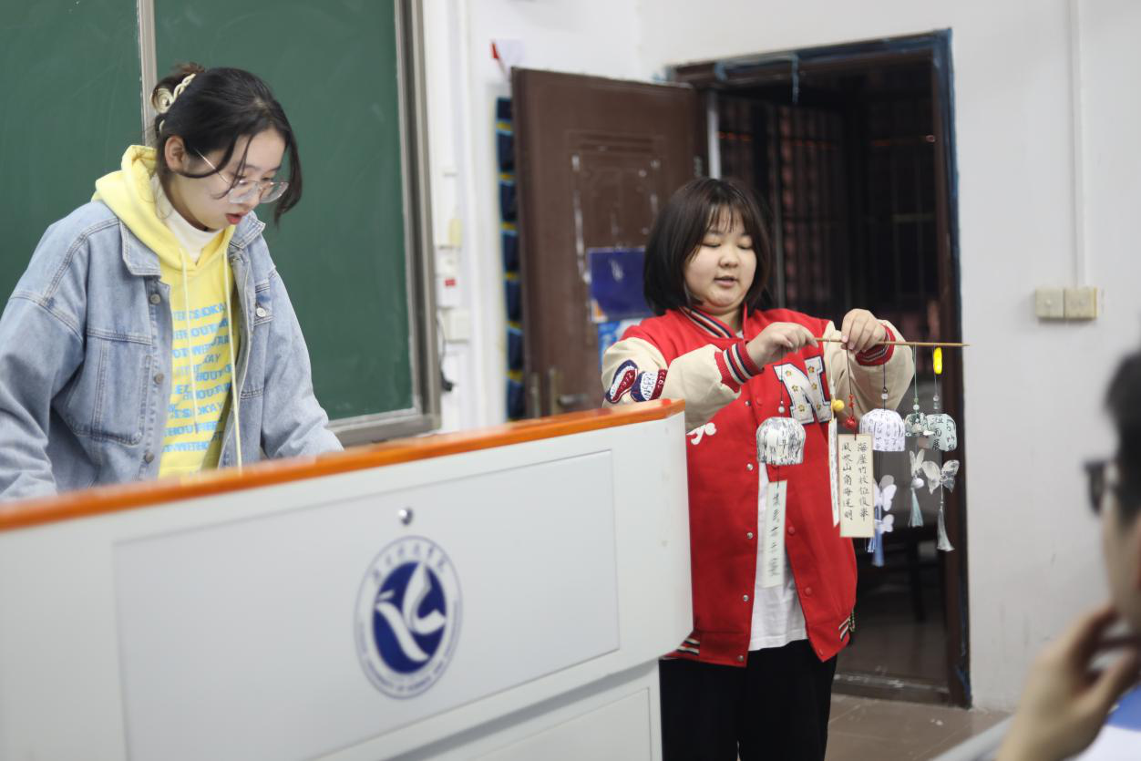 “今生簪花,来世漂亮”,我和评委“簪”一队选取扭扭棒与玛瑙珠作为材料,参考传统簪花造型结合自身创新重新演绎簪花,向大家传递了三月胜二月,春风拂暖,人生向阳的美好祝愿;207队创作的黏土作品以绿色为主色调,契合春分时节万物复苏的自然景象,充满春天的气息;V我50,鸡翅分你一队以废弃的旧蛋壳附着野花制成迷你山体模型,意在提醒大家珍惜和保护环境,体现出绿色生活的理念;上春三队将书法与风铃相结合,深深扎根于传统文化,将书法艺术与自然之美相融合。
