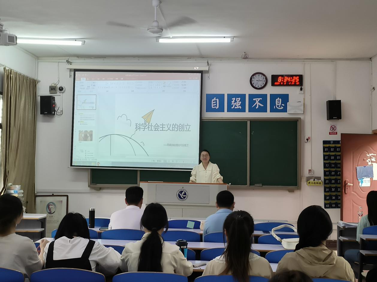 “坚定共产主义信仰,明确中国特色社会主义制度的优越性和先进性”。思政2002班段雅芝以图片的形式导入科学社会主义的基本概念,启发学生思维,引出科学社会主义创立的历史条件,激发学生兴趣。通过对当时历史事件的讲述,让同学们身临其境,体会到科学社会主义创立的不易。