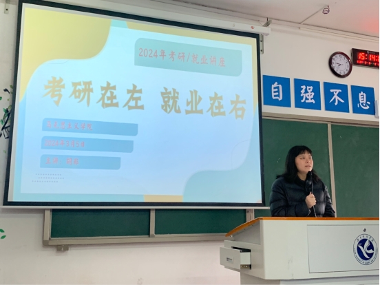 本网讯(记者 杨行青 周灵敏)为切实推进大学生就业指导工作,帮助学生适时树立考研意识与就业意识。3月5日,马克思主义学院于鹤鸣楼501教室召开考研与就业指导主题班会。会议由辅导员胡非主持召开,2021级学生参加。