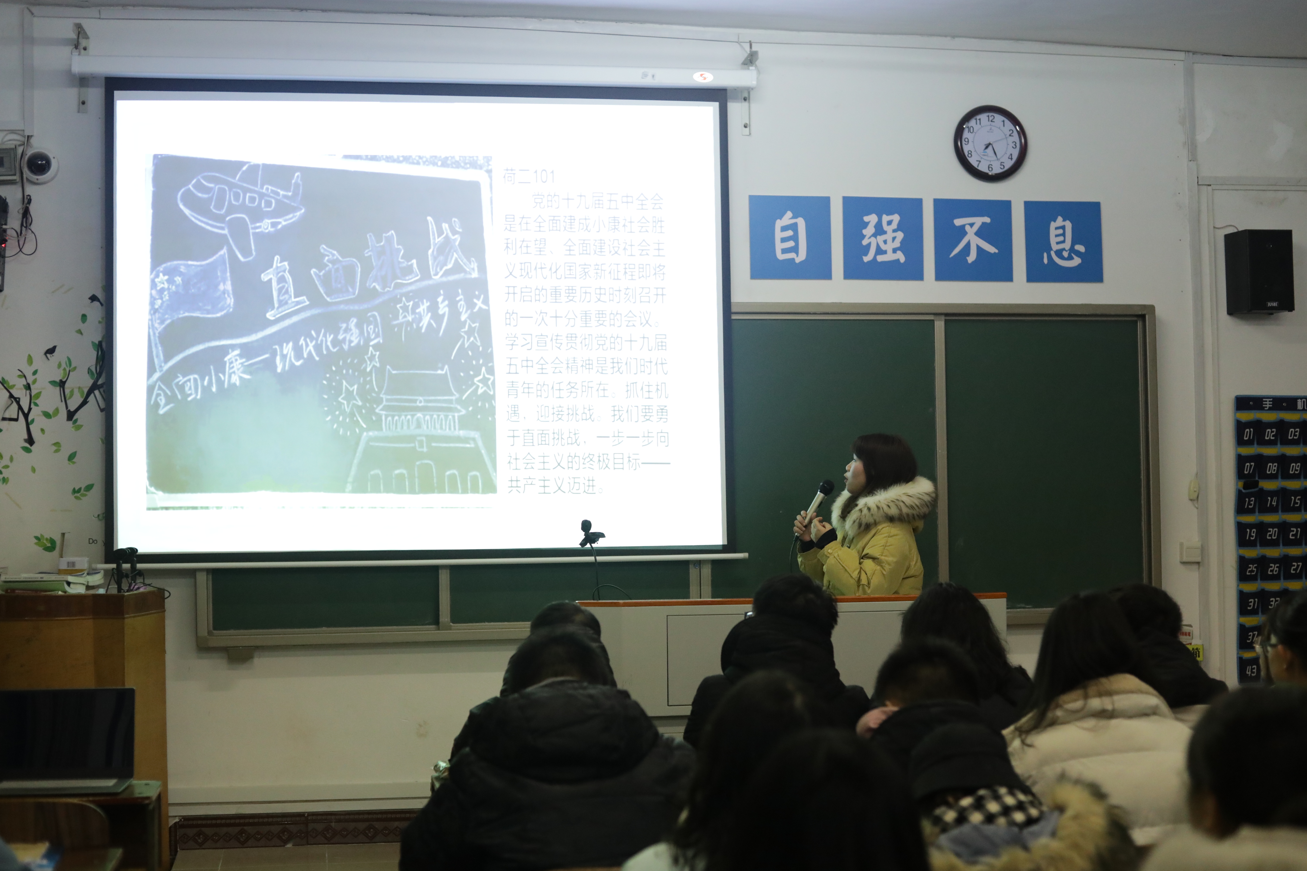 活动现场,各寝室代表从内容、板书、美工、排版、创新五个方面对作品设计理念进行了阐述,黑板报设计形式多样、内容丰富,每一幅作品都体现了各寝室对于十九届五中全会会议内容和精神的理解。