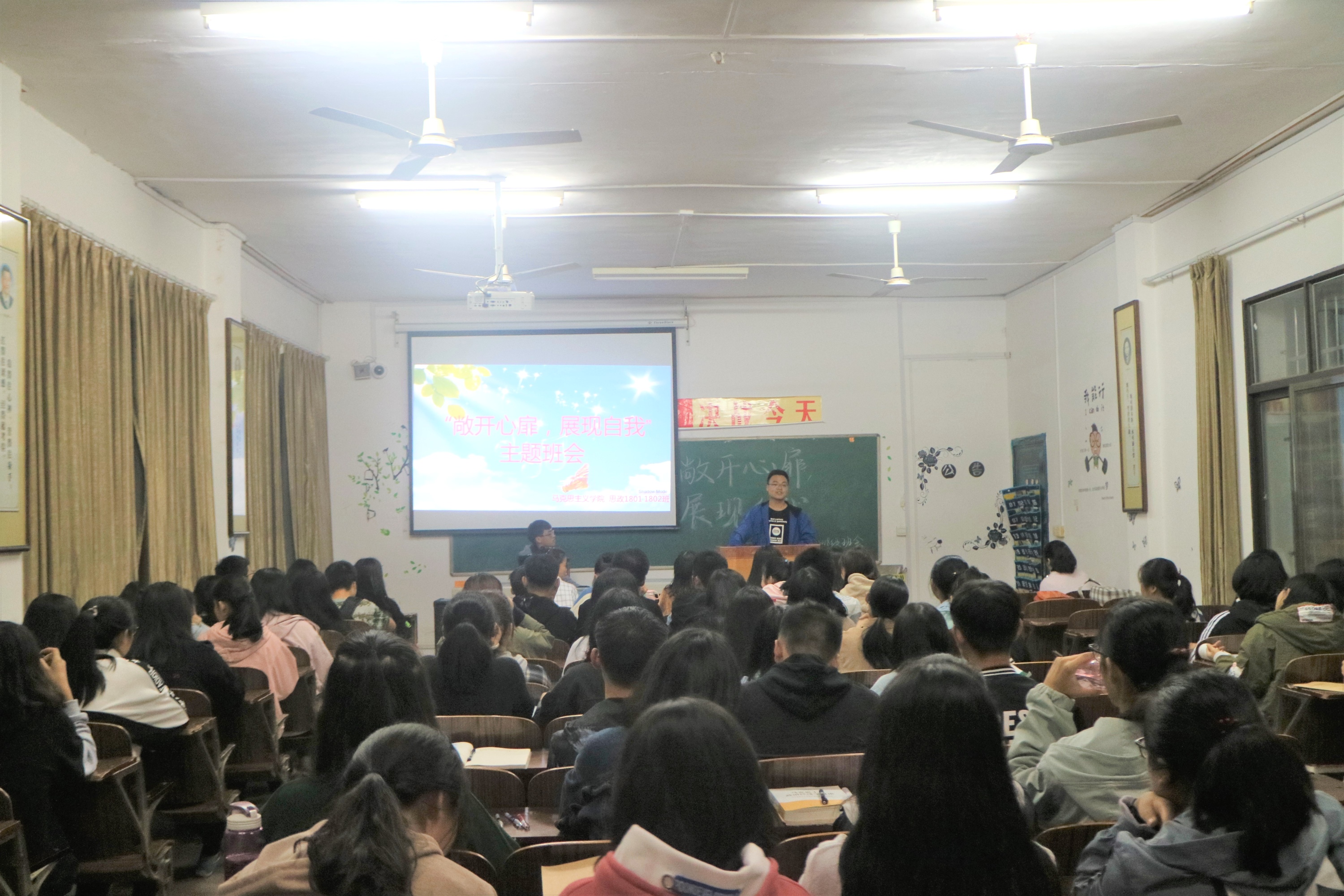 本网讯(通讯员 黎雪平 尹玉婷)为增强学生们的自信心,提升他们抵抗挫折的能力。10月17日晚,马克思主义学院在鹤鸣楼501教室为该院大一全体学生举办了题为“敞开心扉,展现自我”的主题班会。
