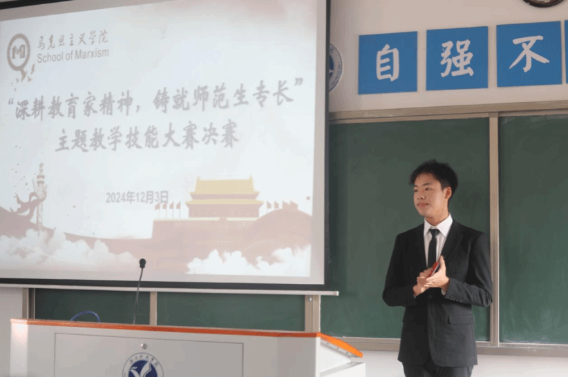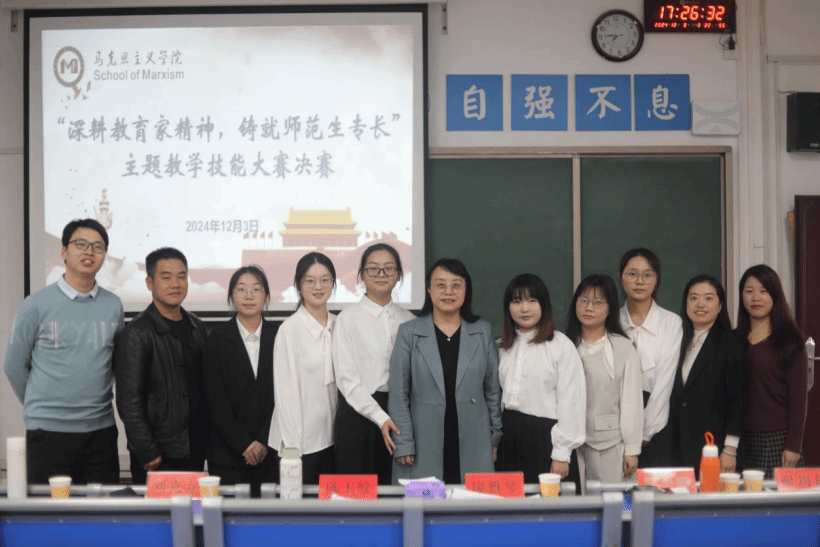 本网讯(记者 杨鑫杰 易淑妍)12月5日,马克思主义学院师范生技能大赛决赛在鹤鸣楼501教室举行。马克思主义学院院长廖雅琴、党总支书记陈玉皎以及优秀青年教师陈小燕、刘克方、谢周艳共同担任评委。