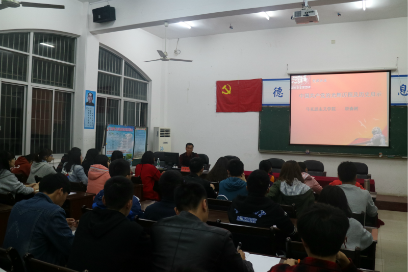 马克思主义学院党总支书记唐森树教授以“中国共产党的光辉历程及历史启示”为主题精彩开讲。他分别从中国共产党创立的历史条件、发展历程、历史意义及启示等方面为全体入党积极分子讲述了党的发展过程,以提问的方式,深入浅出地与各入党积极分子进行互动,活动气氛激昂。