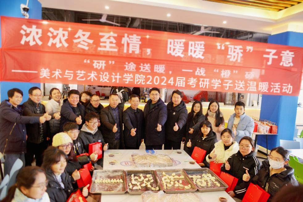 本网讯(通讯员唐天田)暖心过冬至,美院传温情。12月22日中午,“冬至遇上考研”,安博官网app美术与艺术设计学院举办了一场别样的活动。校党委委员、副校长李常健,校党委委员、副校长吴小林,校团委书记万李,美术与艺术设计学院全体领导,毕业班班主任老师和辅导员老师,团学干部们一起为考研学子“包饺子”送祝福。