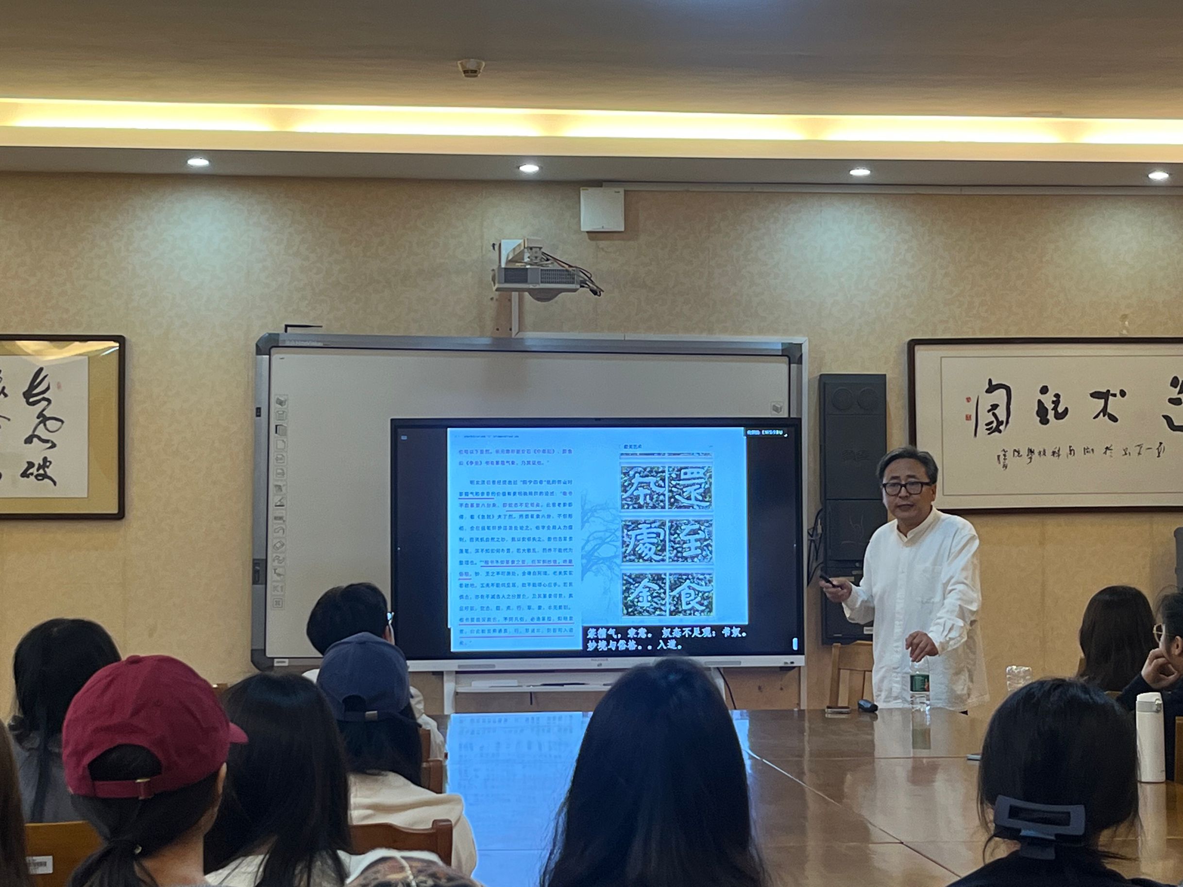 杨频博士以“书法的内部与深度”为题,从“中国人的书法视觉启蒙”开始讲解,从字体、笔法、结构墨法、章法、全局五方面进行详细分析,最后提出审美陌生化原则——艺术史不关心重复的风格。持续两个小时的讲座,观点新颖,条理清晰,语言幽默。杨频博士还通过大量的图例、事例配合讲述,并不时与现场师生巧妙互动交流,使得整场讲座氛围热烈而活泼。