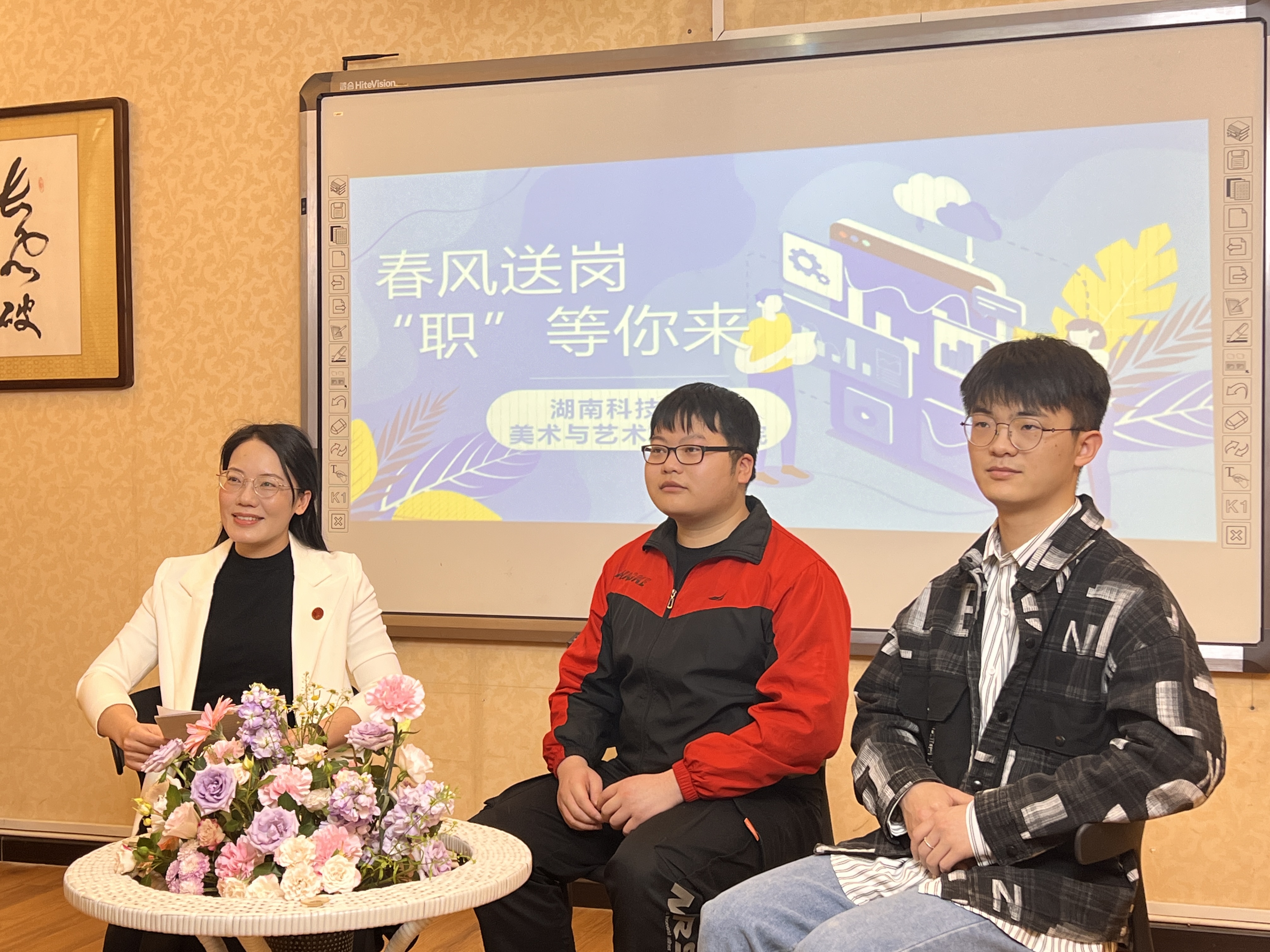 本网讯(通讯员 卿可青)2022年4月14日上午10时30分,安博官网app美术与艺术设计学院联合6家优秀校友企业在南楼202举行“春风送岗·‘职’等你来”线上直播招聘会。本次招聘会现场由美院党总支书记刘华主持,6名毕业生代表参与互动,线上有150余名学生进行观看。