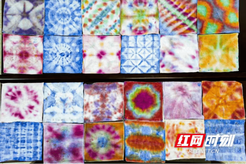 在非遗扎染体验课上,志愿者化身专业讲师,拆解扎染的经典技法,手把手教孩子们完成布料的折叠、捆扎、浸染等步骤。孩子们全心投入创作,收获了一件件图案独特的扎染作品。
