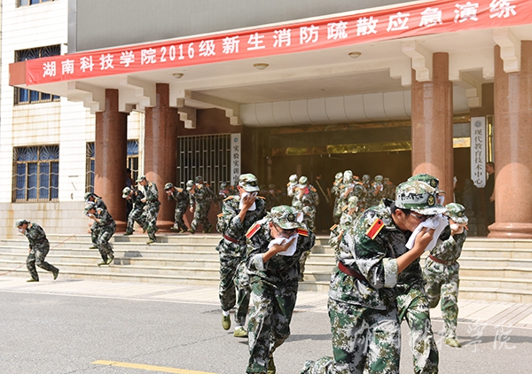 本网讯(通讯员 李瑛 摄影 何帅文)“快、快、快......大家匍匐前进,注意用湿毛巾捂住口鼻。”保卫处多名干警指挥学生快速撤离弘毅楼。9月18日上午,我校保卫处联合零陵区消防大队在弘毅楼举行2016级新生消防疏散应急演练,副校长吴小林出席。