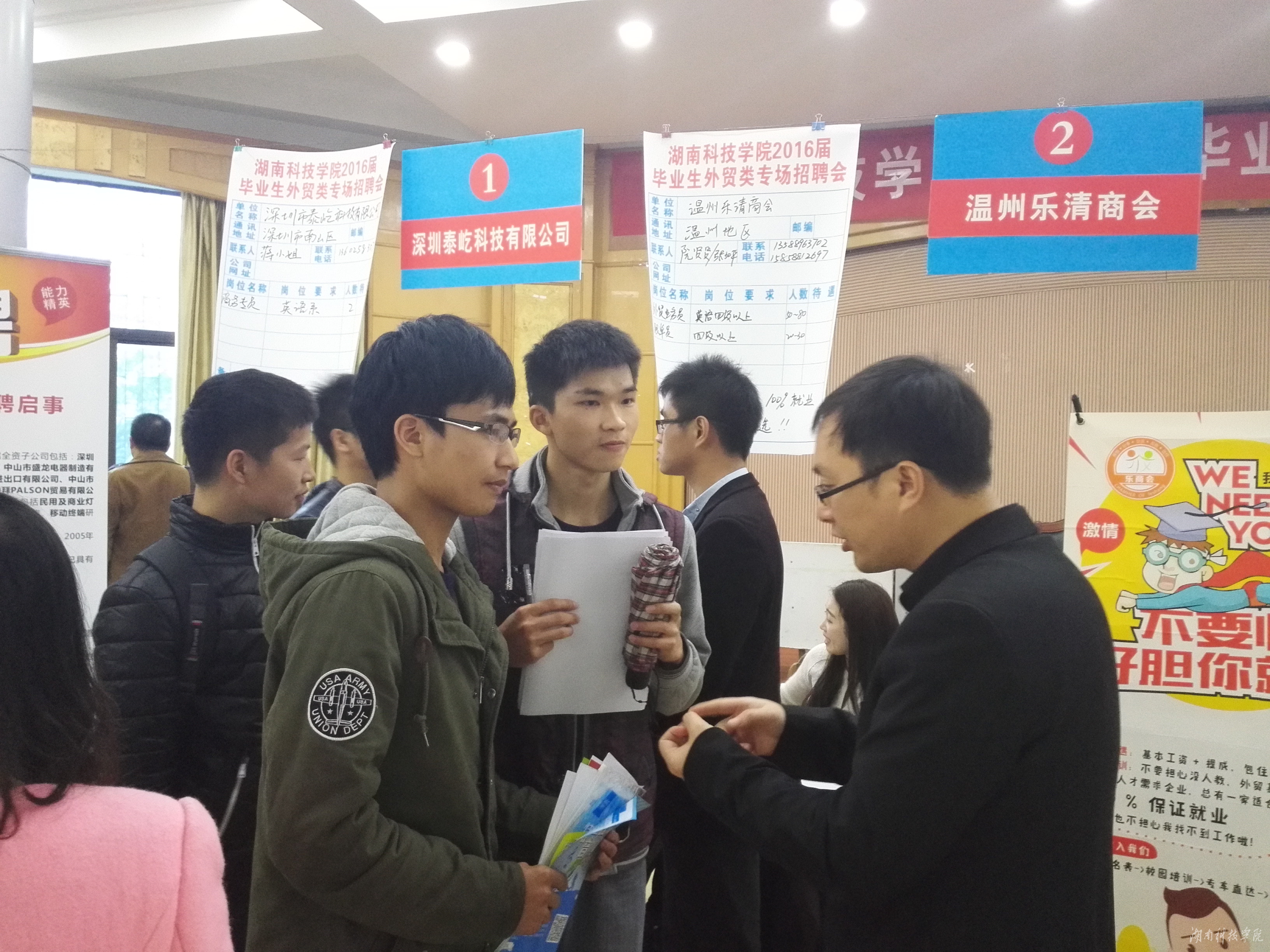 本网讯(通讯员 杜俊杰)3月20日,由我校就业创业指导中心主办、外国语学院承办的2016届毕业生外贸类专场招聘会在明德楼二楼多功能厅举行。本次招聘会共吸引了17家用人单位参会,提供就业岗位300多个,会后近30名毕业生与用人单位初步达成就业意向。