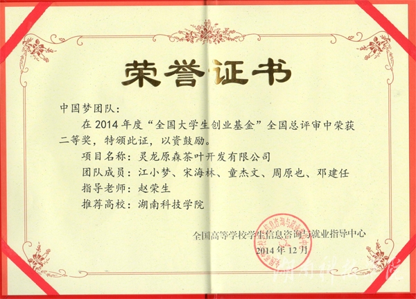本网讯(安博中国处供稿)12月5日至7日,2014年全国大学生创业基金总评审在天津举行。我校大学生就业创业促进协会“中国梦”学生创业团队的“灵龙原森茶叶开发有限公司”荣获二等奖,并将获得20万元左右的创业启动基金。
