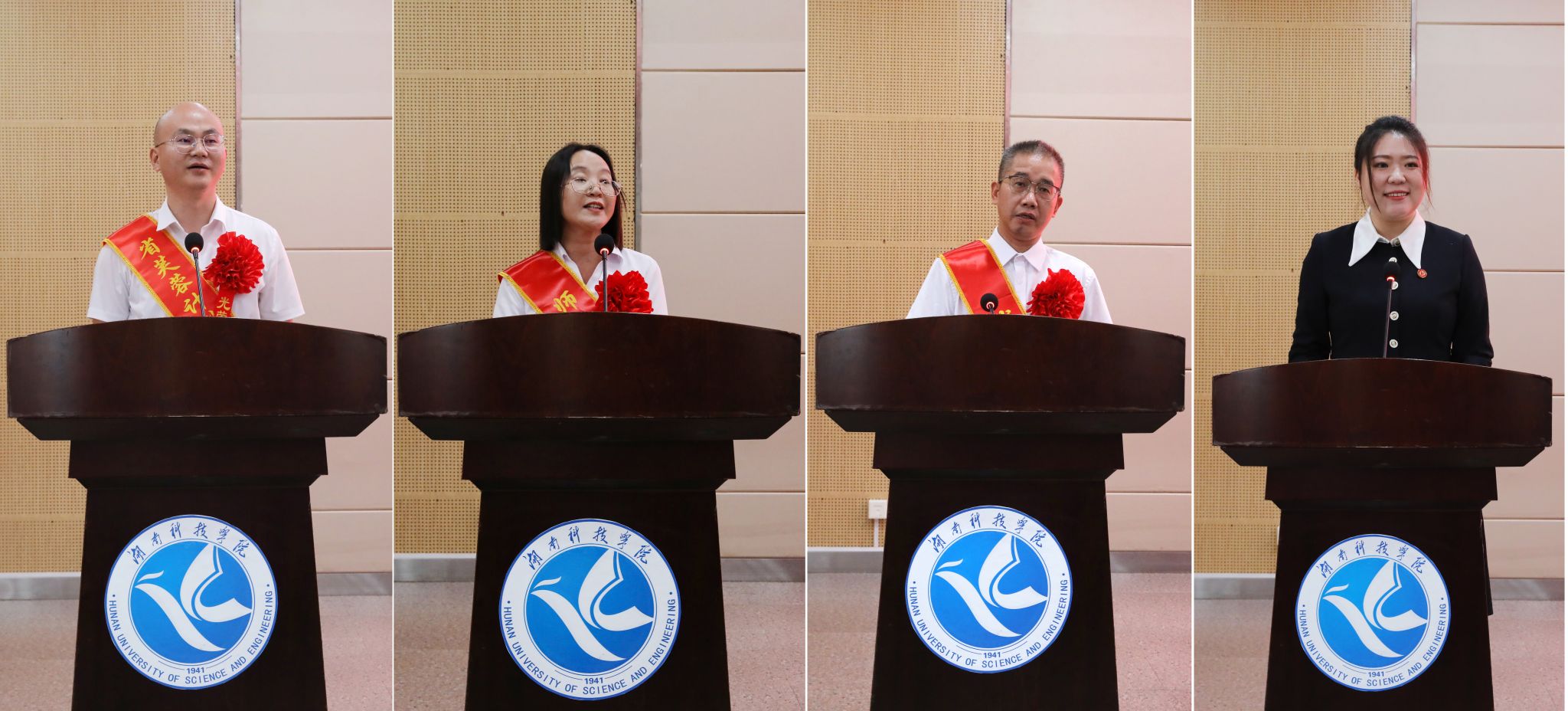 “省级人才项目入选者”教师代表刘进以“感恩”、“责任”、“真诚”、“梦想”为关键词,分享了扎根科院、潜心教学科研的感悟和经验;“校师德师风先进个人”教师代表方芳通过三个育人故事,传递了从教二十载“以心育心、以德育德”的心得体会,“校优秀教师”代表肖智成以二十余年教坛耕耘为脉络,生动诠释对“做助推教育强国与民族复兴的‘大先生’” 的理解与追求;新进教师代表张藜萱从入职体验出发,深情分享在科院感受到的浓厚育人治学氛围和教育家精神力量。