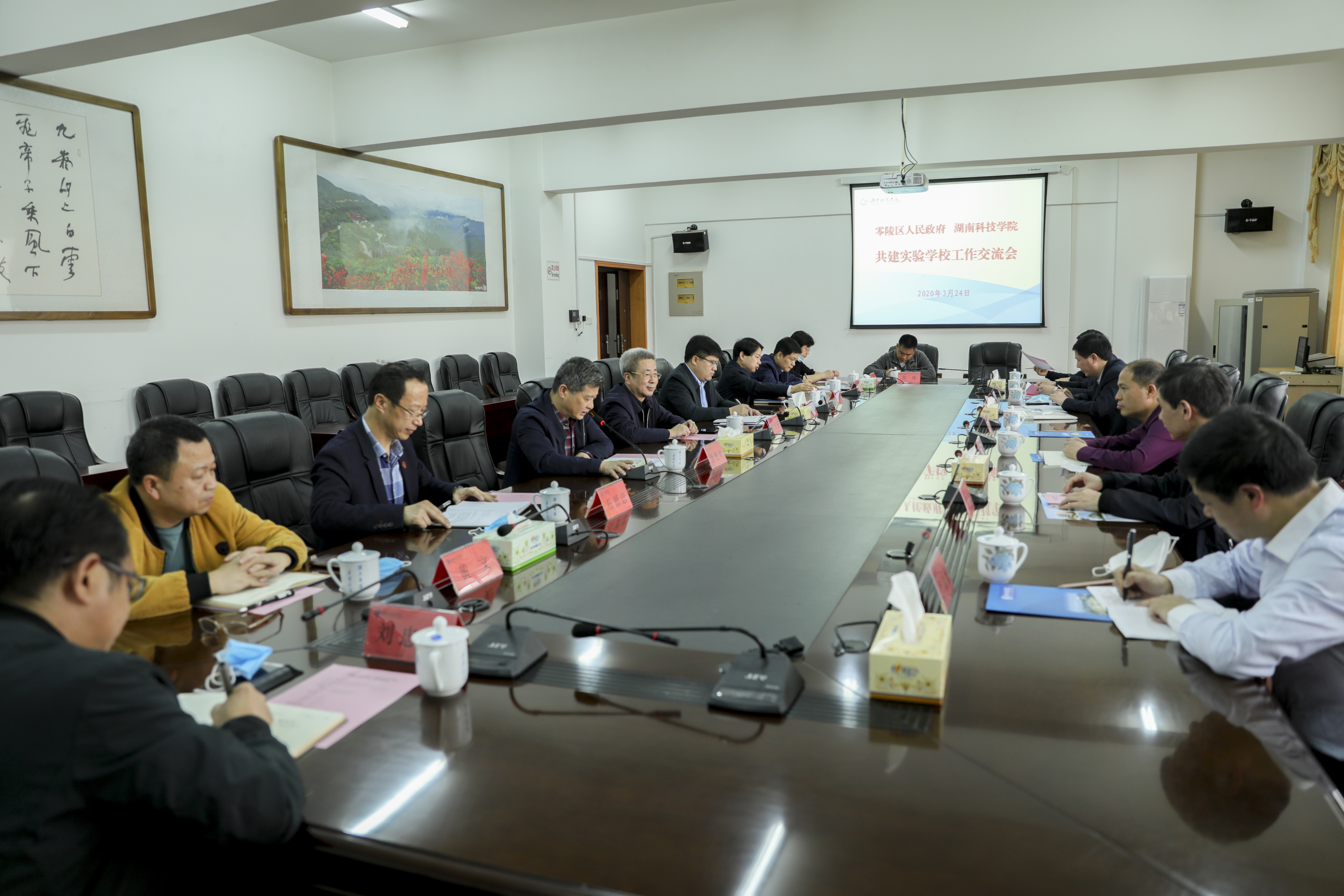 本网讯 3月24日下午,零陵区副区长张国材、零陵区教育局长唐天光、永州九中校长蒋松军一行来校,围绕共建实验学校合作细节进行交流探讨。校党委书记曾宝成,党委副书记、校长李钢,党委副书记、工会主席唐艳明,副校长李常健出席会议。会议由唐艳明主持。