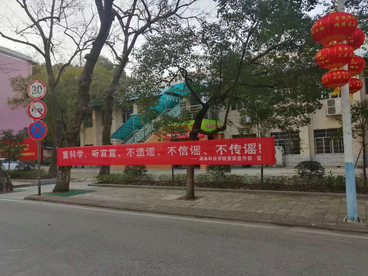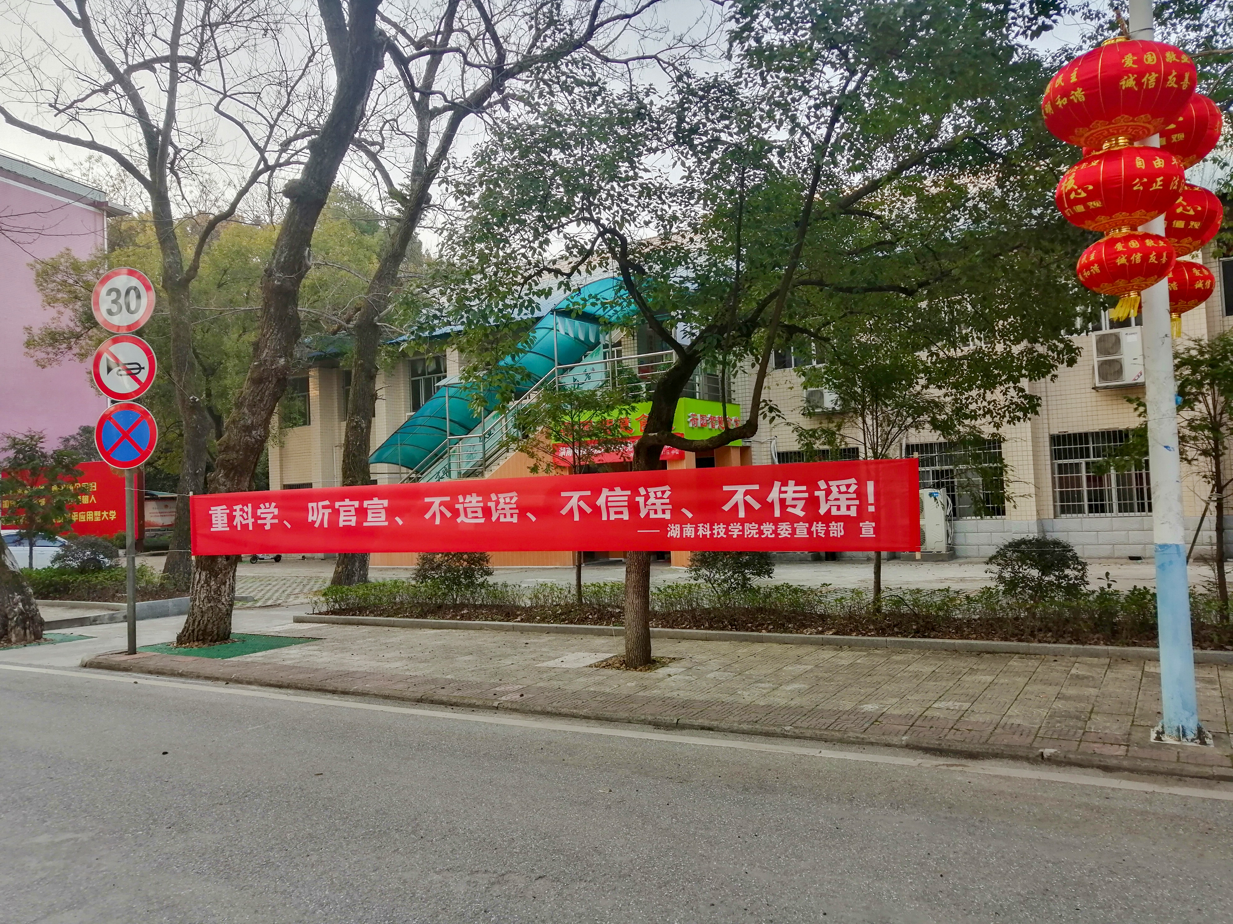 本网讯 “亲戚不走,来年还有。朋友不聚,回头再叙。”在学校东门及校园主干道两旁,一条条硬核宣传标语逐一亮相,号召大家科学应对,坚定信心,共同助力新型冠状病毒感染的肺炎防控工作,坚决打赢疫情防控阻击战!