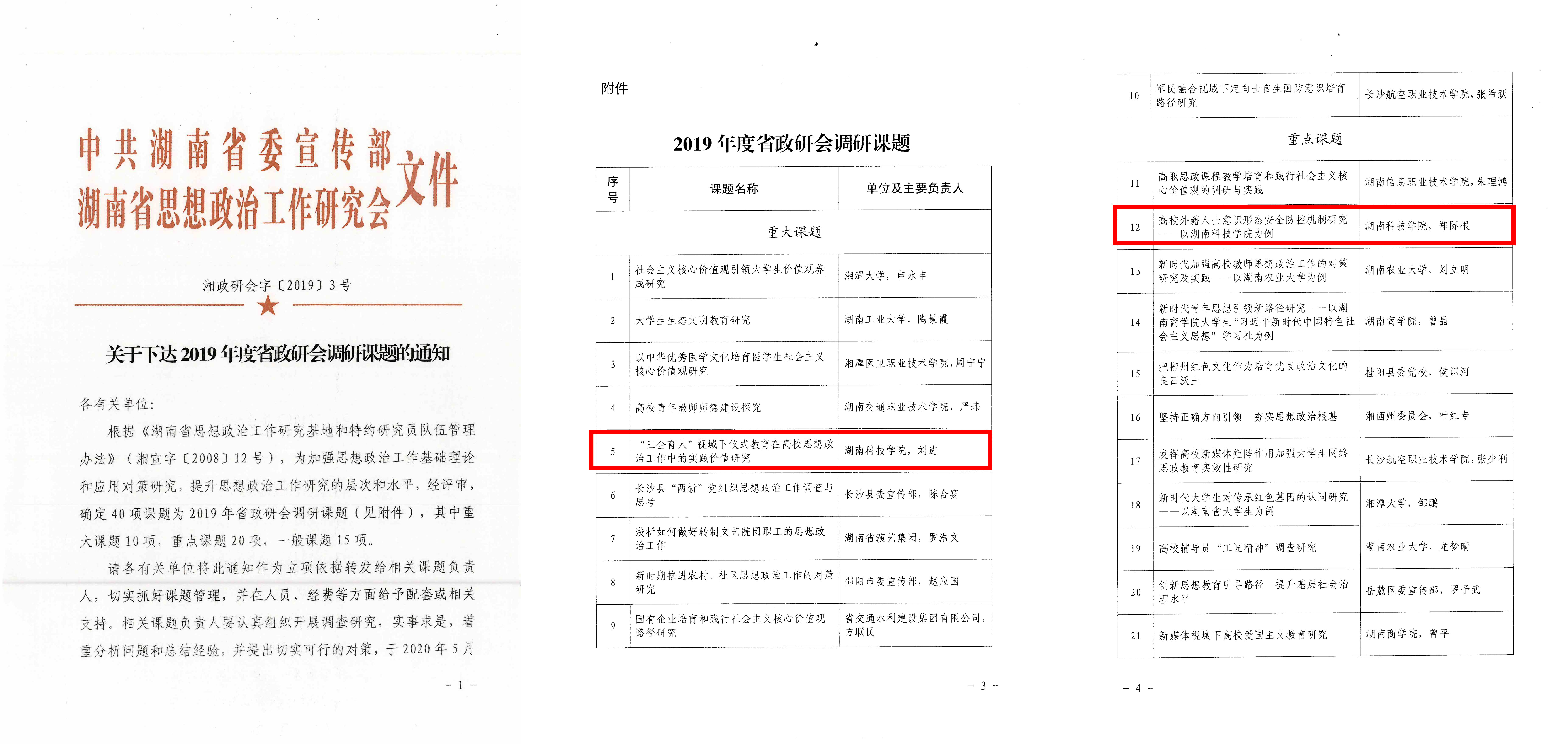 本网讯 12月23日,中共湖南省委宣传部、湖南省思想政治工作研究会发布《关于下达2019年度省政研会调研课题的通知》,我校旅游与文化产业学院教师刘进申报的《“三全育人”视域下仪式教育在高校思想政治工作中的实践价值研究》获重大课题立项,国际交流与合作处处长郑际根申报的《高校外籍人士意识形态安全防控机制研究——以安博官网app为例》获重点课题立项。