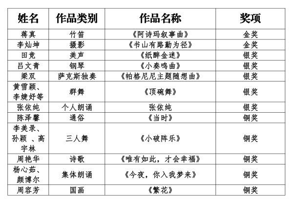 自该活动启动以来,学校团委精心组织,广泛发动,全校师生踊跃报名,经过层层筛选共选送绘画、摄影、书法、声乐、舞蹈、器乐、朗诵等8个类别共计45件作品参赛,并斩获佳绩。其中,荣获金奖2项,银奖5项,铜奖5项,校团委荣获“优秀组织奖”。