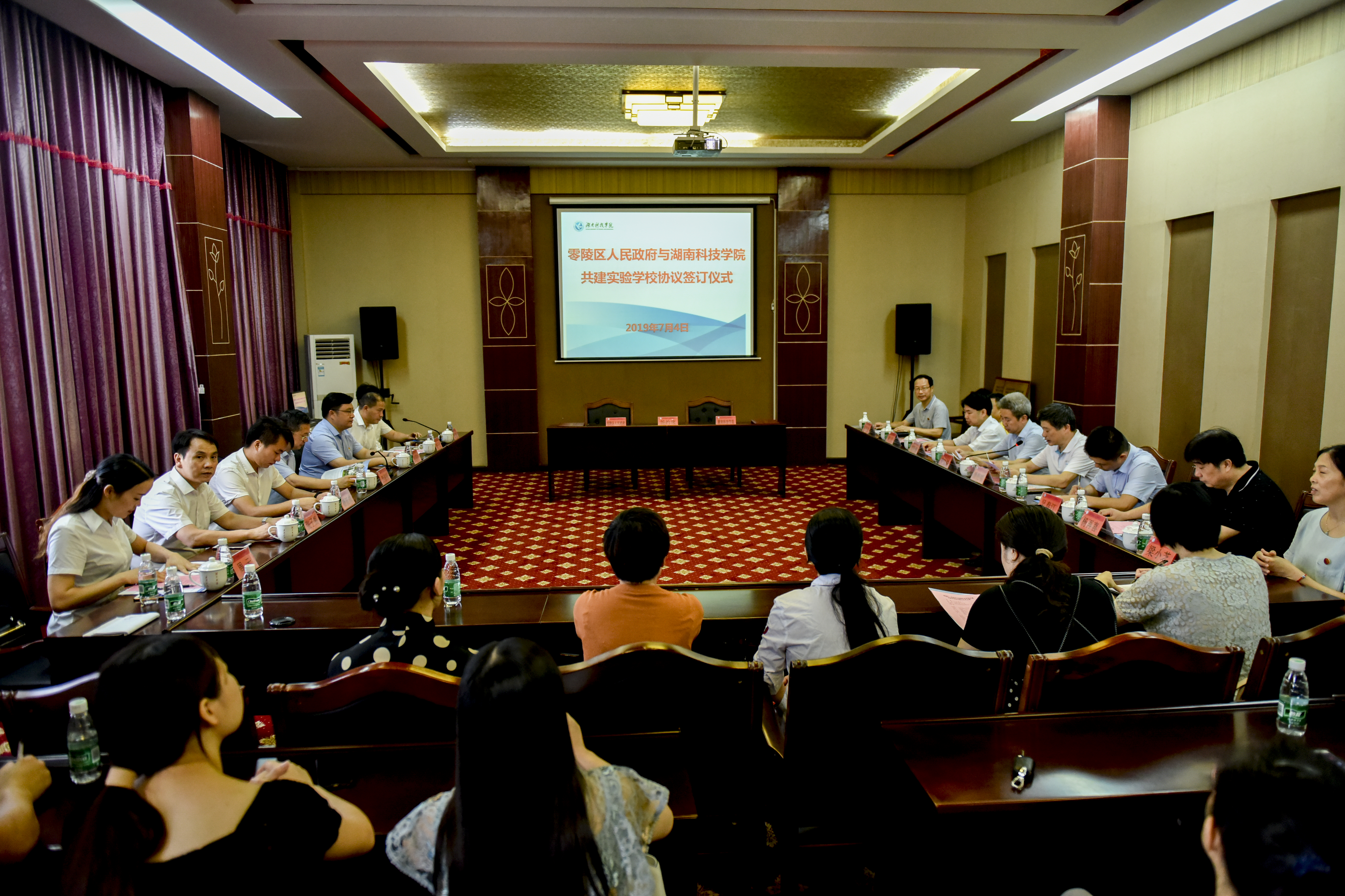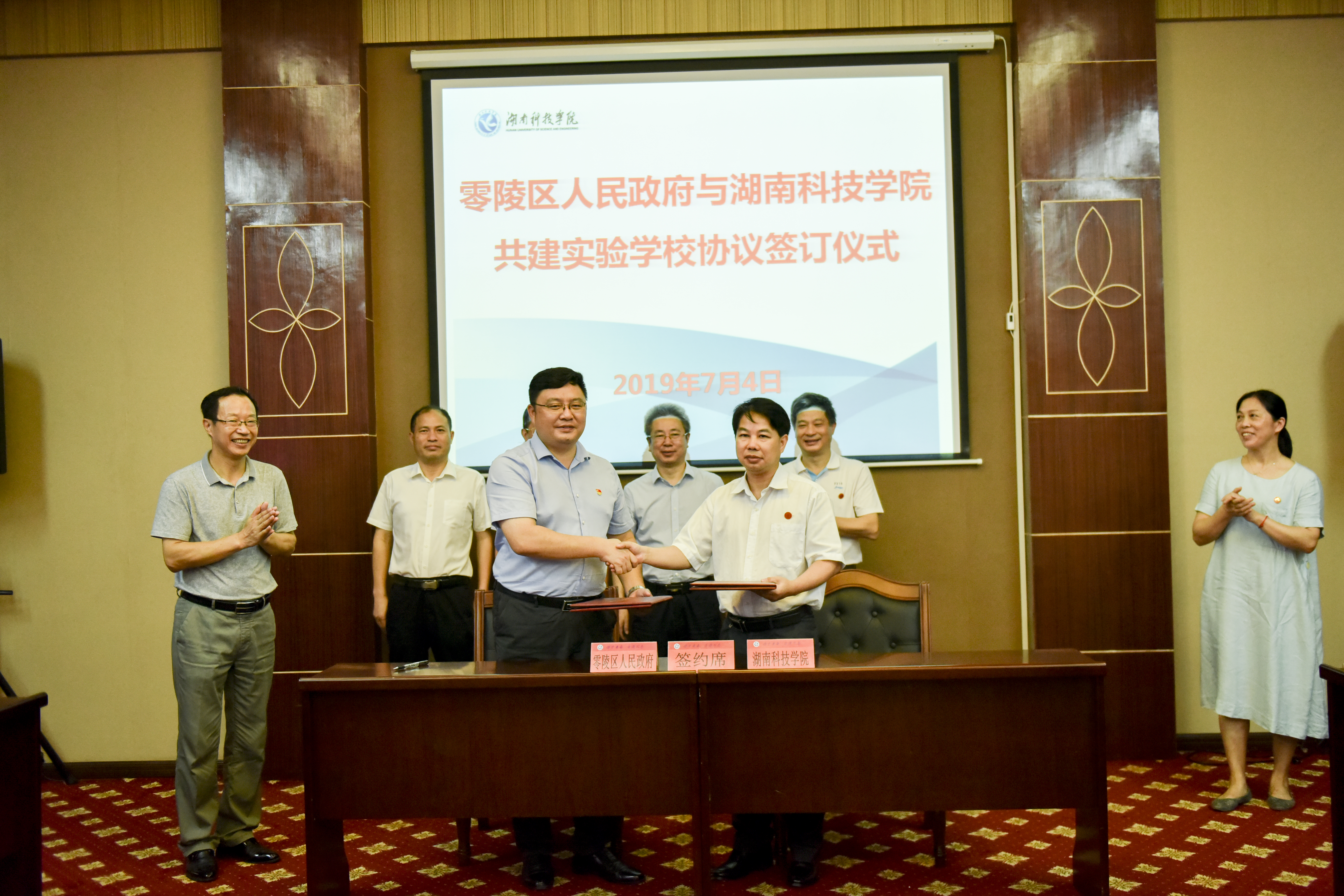 本网讯 7月4日,我校与零陵区人民政府举行共建实验学校签约仪式。永州市教育局副局长李谋韬,零陵区副区长张国材,零陵区教育局长唐天光,党委书记、校长曾宝成,党委副书记唐艳明,副校长李常健,永州九中、零陵区杨梓塘小学负责人一同见证签约。仪式由唐艳明主持。