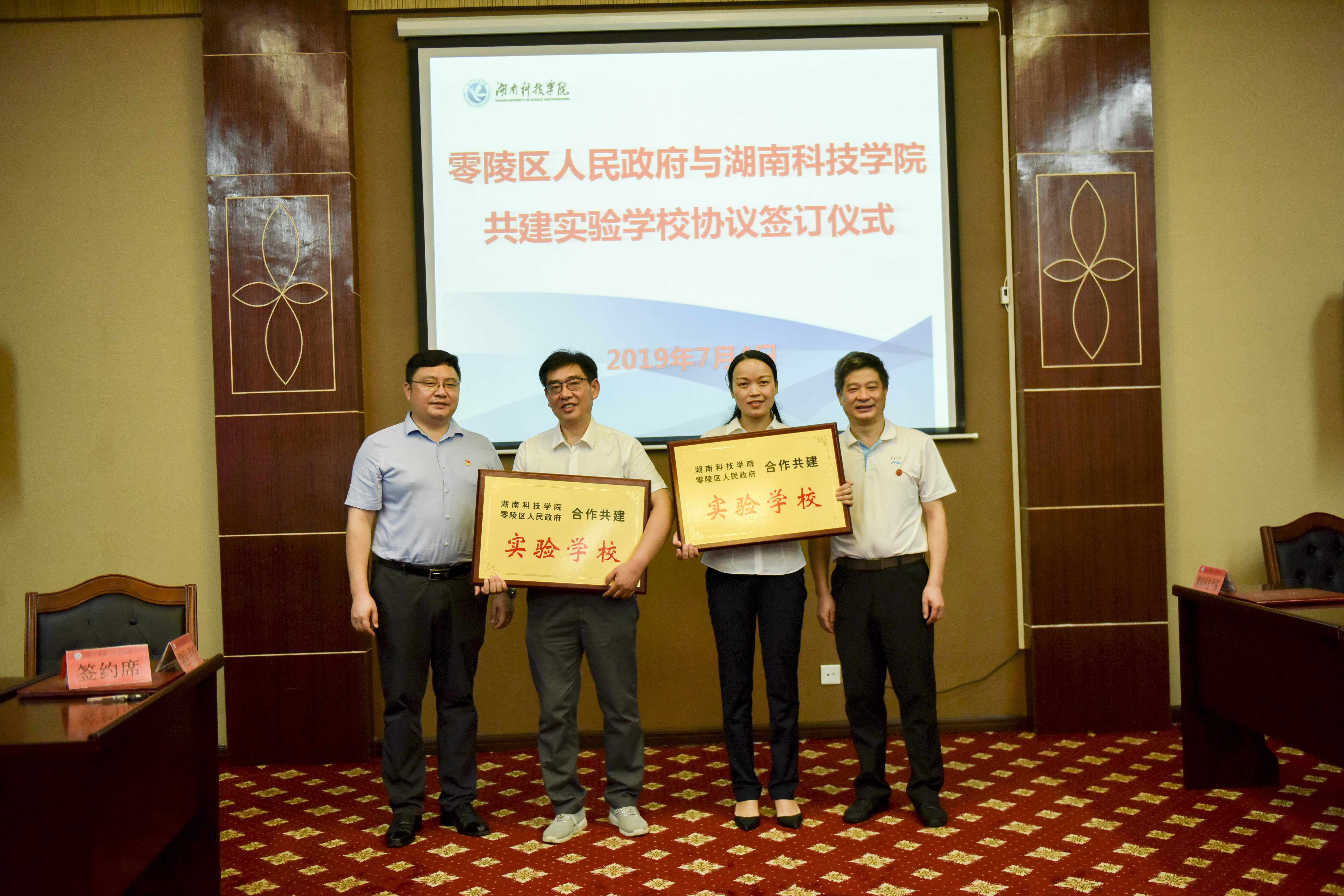 李常健代表学校、张国材代表零陵区人民政府现场签订共建实验学校协议。唐艳明、张国材分别为零陵区杨梓塘小学、永州九中授予“零陵区人民政府、安博官网app共建实验学校”的牌匾。