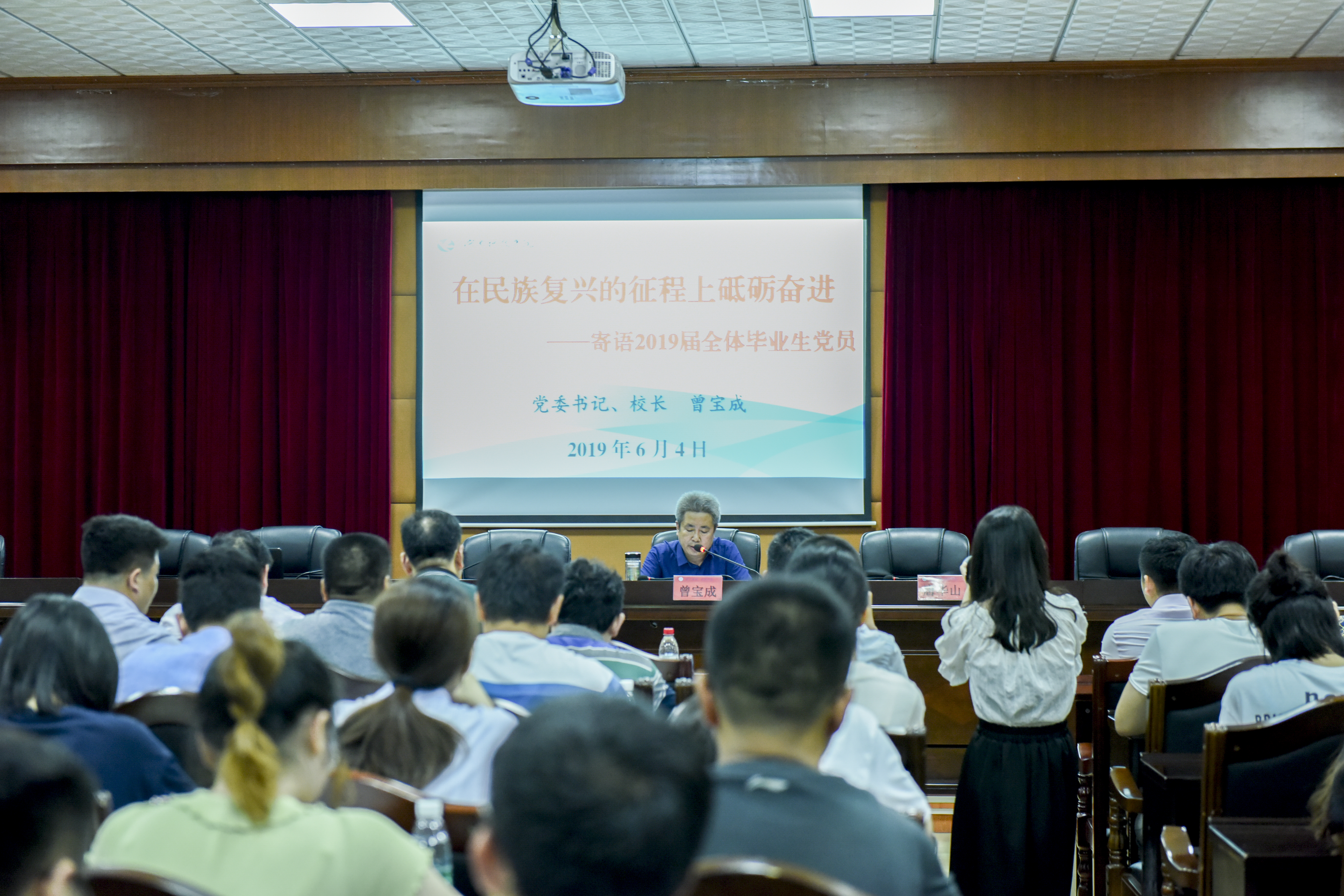 本网讯 6月4日晚,党委书记、校长曾宝成为即将离校的毕业生党员授党课,勉励全体毕业生党员坚定理想信念,提高党性修养,练就过硬本领,在中华民族伟大复兴的新征程上砥砺奋进。各教学学院党总支副书记、辅导员、学工部相关人员以及2019届毕业生党员参加。