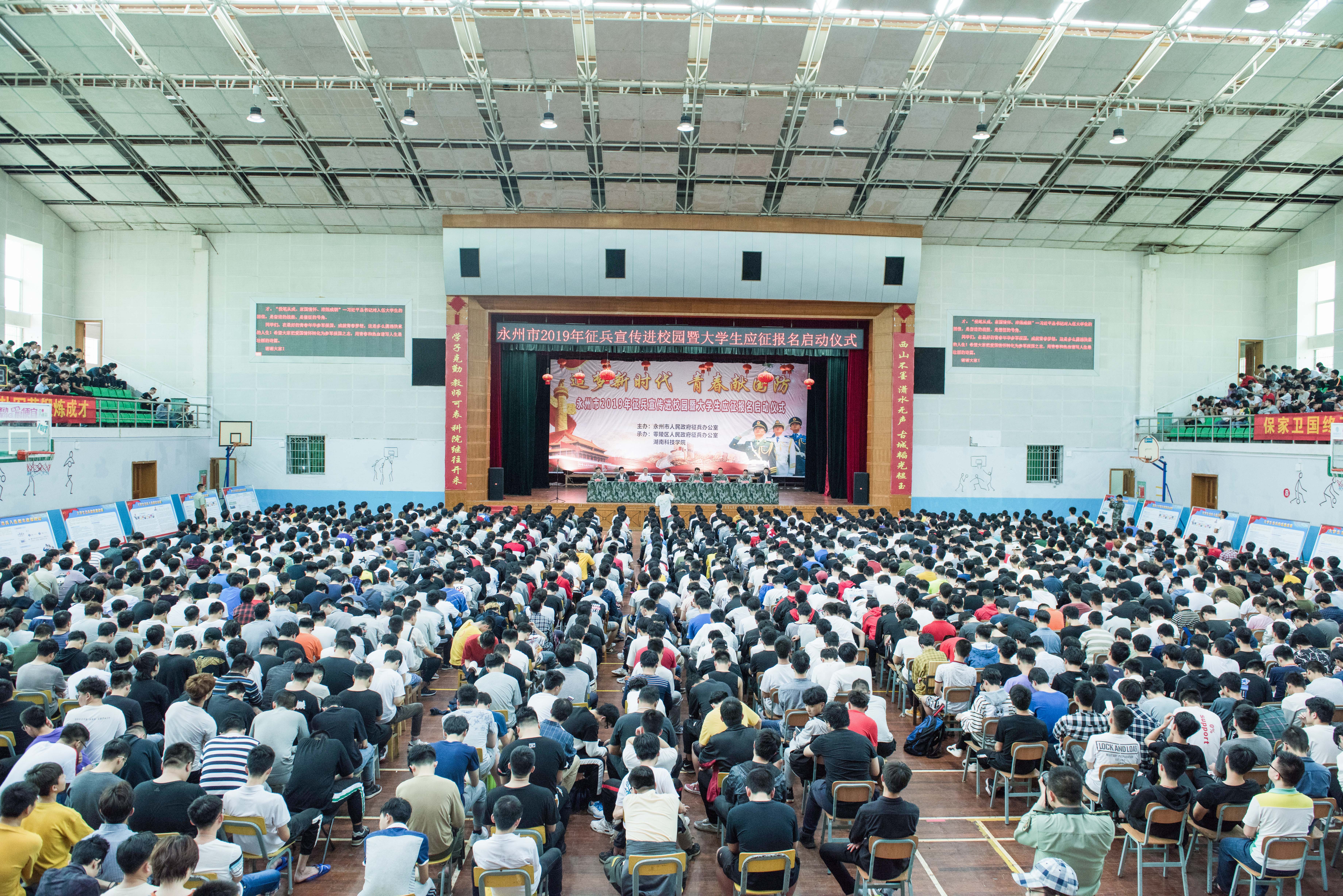 本网讯 建功新时代,青春献国防。4月23日,永州市2019年征兵宣传进校园暨大学生应征报名在我校启动,市委常委、市委宣传部部长贺辉,市委常委、军分区政委冯紫英,军分区副司令员陆鸿,军分区动员处处长唐柳军,零陵区委常委、区人武部部长王建武,我校党委书记、校长曾宝成,副校长程智开,学工部、武装部长唐华山以及3000余名学生参加启动仪式。仪式由陆鸿主持。