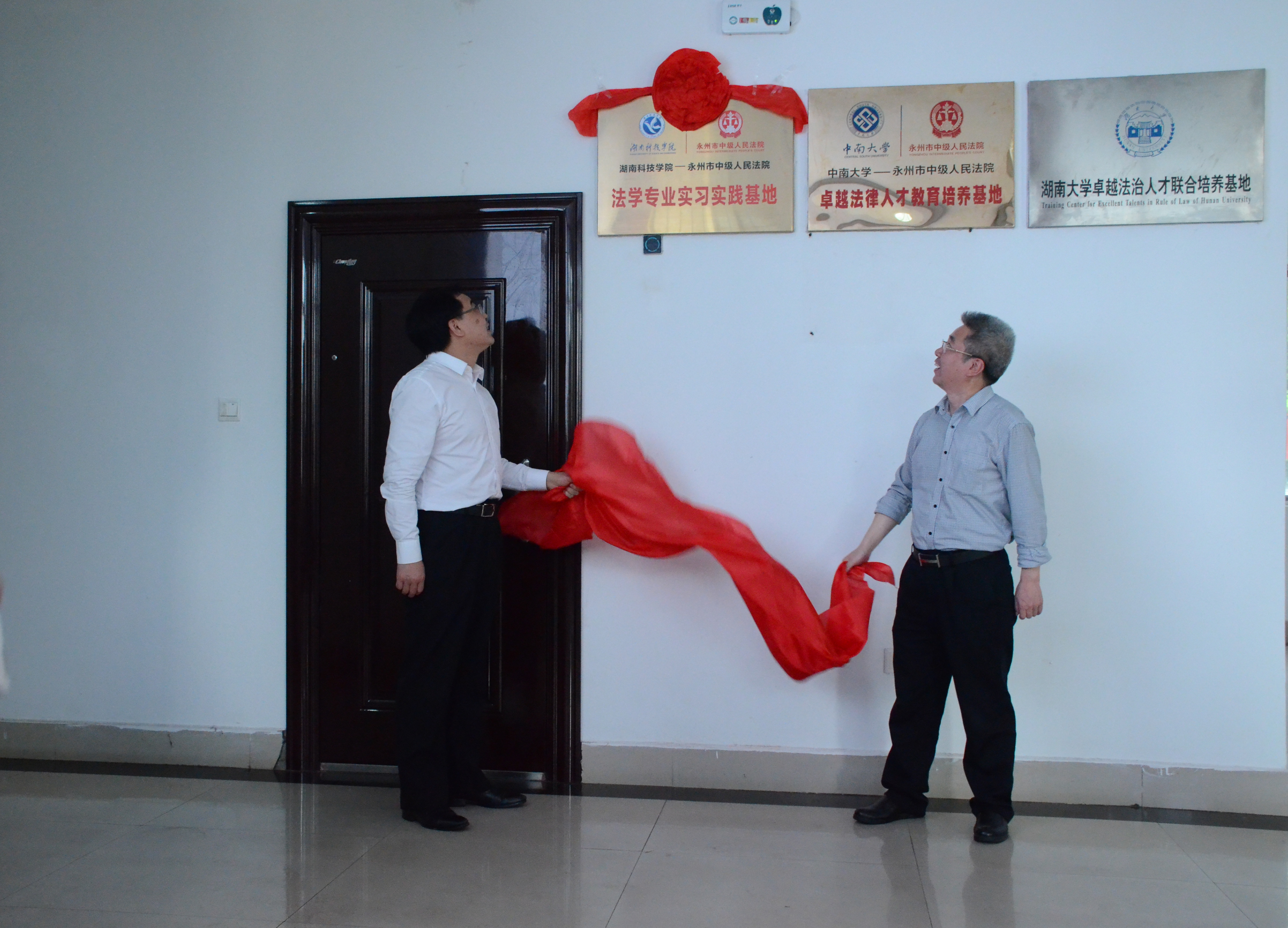 本网讯 4月9日上午,“安博官网app法学专业实习实践基地”揭牌仪式在永州市中级人民法院举行,市中级人民法院党组书记、院长罗重海和校党委书记、校长曾宝成共同为基地揭牌。市中级人民法院副院长高和平、郭红艳,副校长李常健及人文与社会科学学院负责人等参加揭牌仪式。