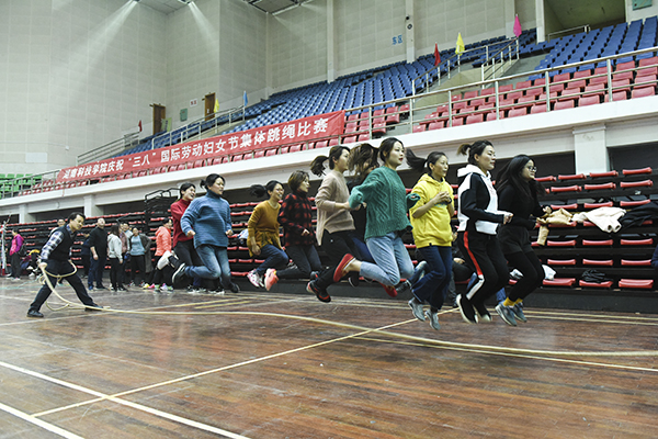 本网讯 3月8日下午,为庆祝“三八”国际妇女节,丰富我校女教职工的业余生活,我校以健康为中心,以活动为纽带,在体育馆举行教职工跳绳比赛。校党委副书记、工会主席唐艳明在现场为职工们加油助威。