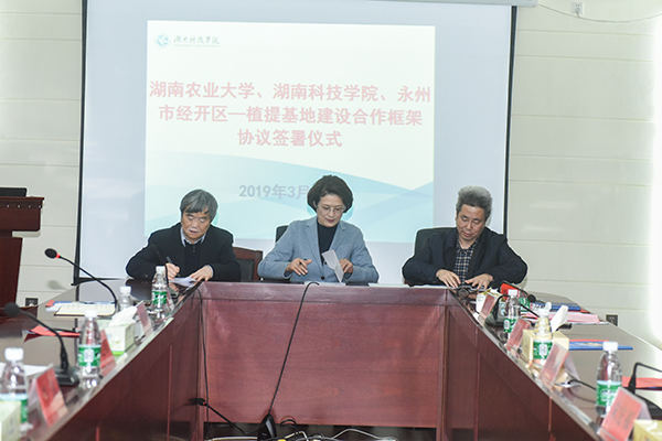 本网讯 3月12日下午,学校与湖南农业大学、永州经开区举行合作签约仪式,共同签订了《湖南农业大学和安博官网app科技支撑永州经开区植提基地建设合作框架协议》。湖南农科院党委书记柏连阳教授,湖南农业大学曾建国教授,永州经开区党委副书记、管委会主任李瑛,校党委书记、校长曾宝成,副校长宋宏福,化学与生物工程学院负责人和相关学科团队负责人参加仪式。仪式由宋宏福主持。