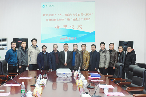 曾宝成与李海荣共同为“校企合作基地”授牌,唐艳明与李海荣共同为“‘人工智能与光学自动化技术’荣旭创新实验室”暨“校企合作基地”授牌,现场响起热烈的掌声。