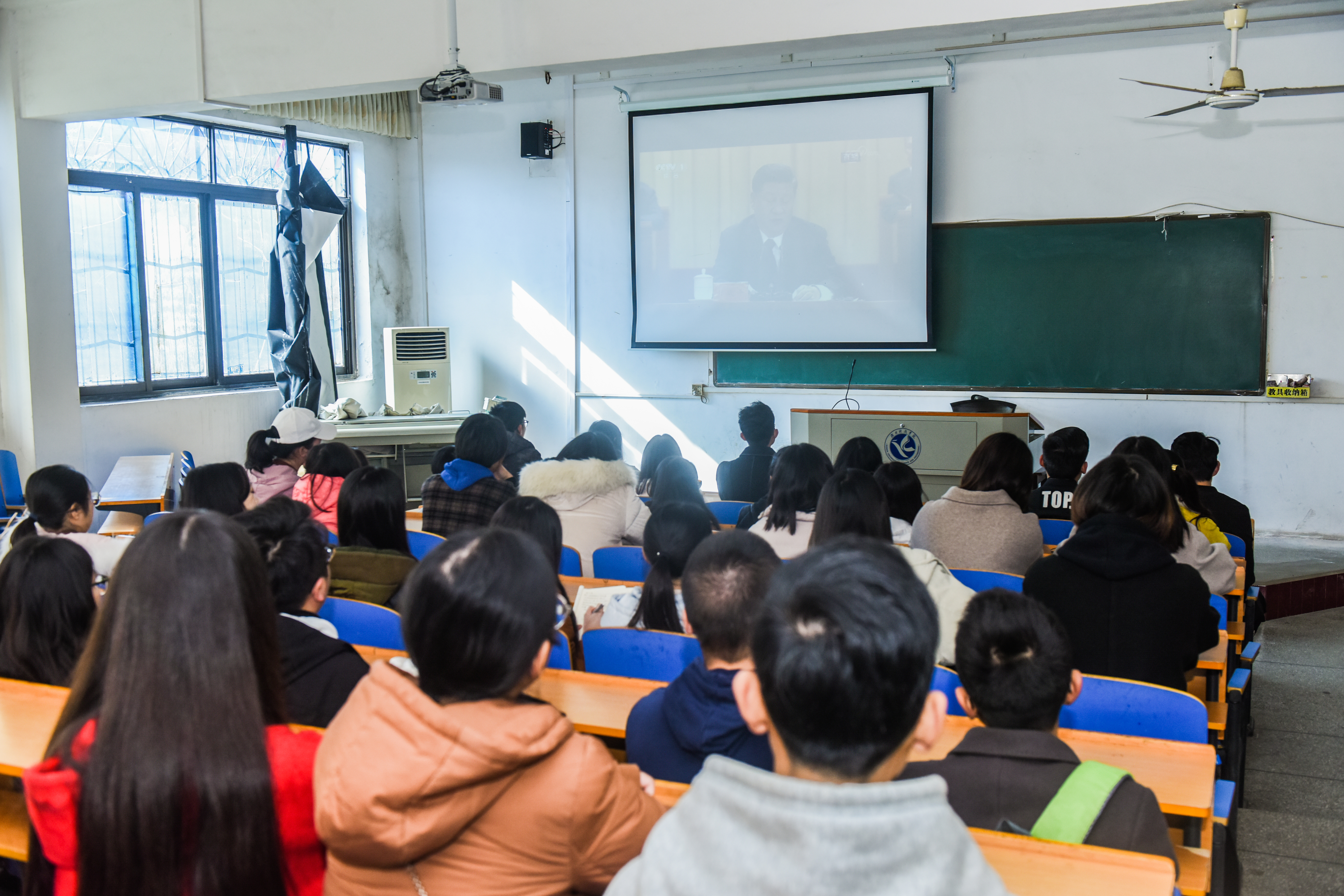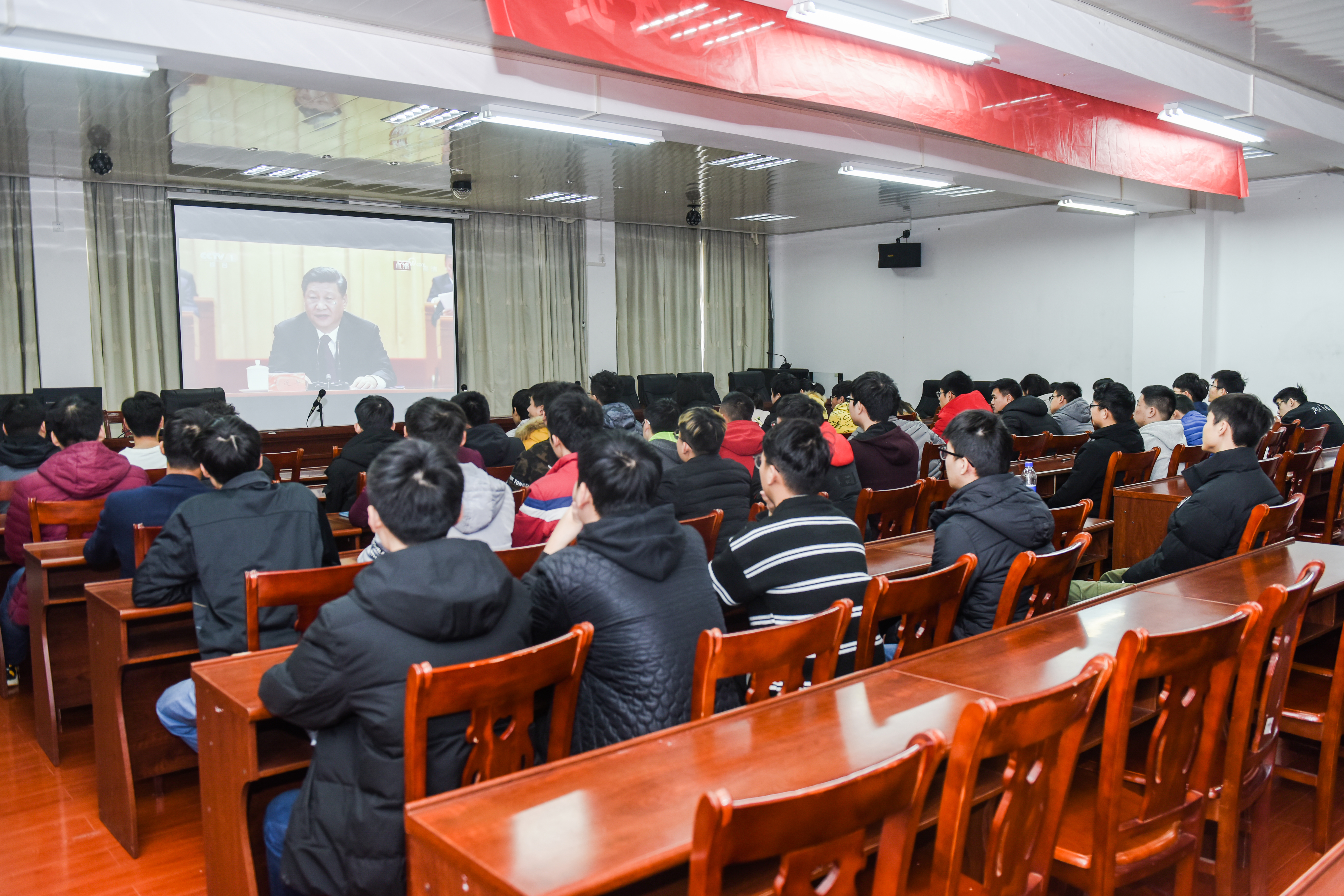 当大会中播放国歌的声音响起,全体师生起立同唱国歌。会上,习近平总书记发表重要讲话,回顾改革开放40周年的光辉历程,深刻总结改革开放的宝贵经验。“改革开放是我们党的一次伟大觉醒”“改革开放是党和人民大踏步赶上时代的重要法宝”“改革开放已走过千山万水,但仍需跋山涉水”……在观看直播的现场,广大师生全神贯注,仔细地聆听,详细地记录,频繁地点头示意,纷纷为报告精彩之处点赞,为改革开放40年的光辉历程感到无比骄傲,为伟大祖国的繁荣昌盛感到无比自豪。