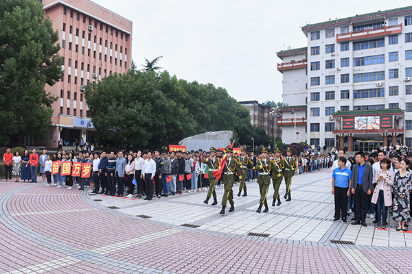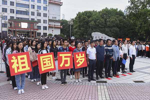 本网讯 10月1日早上7时许,迎着初升的朝阳,鲜艳的五星红旗伴随着庄严的国歌声冉冉升起,全体师生肃立行注目礼,校党委书记陈弘与全场1500余名师生齐声高唱国歌,衷心祝福祖国繁荣昌盛,为伟大祖国喝彩。
