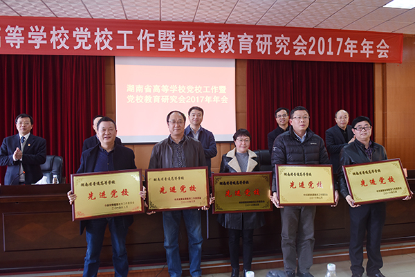 雷桂平宣读《关于湖南省高等学校先进党校表彰决定》,16所高校获“湖南省先进党校”称号,我校党校获此殊荣。