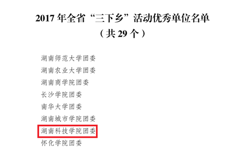 本网讯 近日,省委宣传部、团省委、省教育厅、省文明办、省学联印发《关于2017年全省大中专学生志愿者暑期文化、科技、卫生“三下乡”社会实践活动优秀单位、优秀个人、优秀指导者和优秀服务团队的通报》(湘团联〔2017〕51号),我校荣获2017年全省大中专学生志愿者暑期文化、科技、卫生“三下乡”社会实践活动“优秀单位”称号,土木与环境工程学院“保护古建筑,传承中华文化”实践团获评省“优秀服务团队”,张俭民等5名教师获评“优秀指导者”,郑尚明等8名学生获评“优秀个人”。