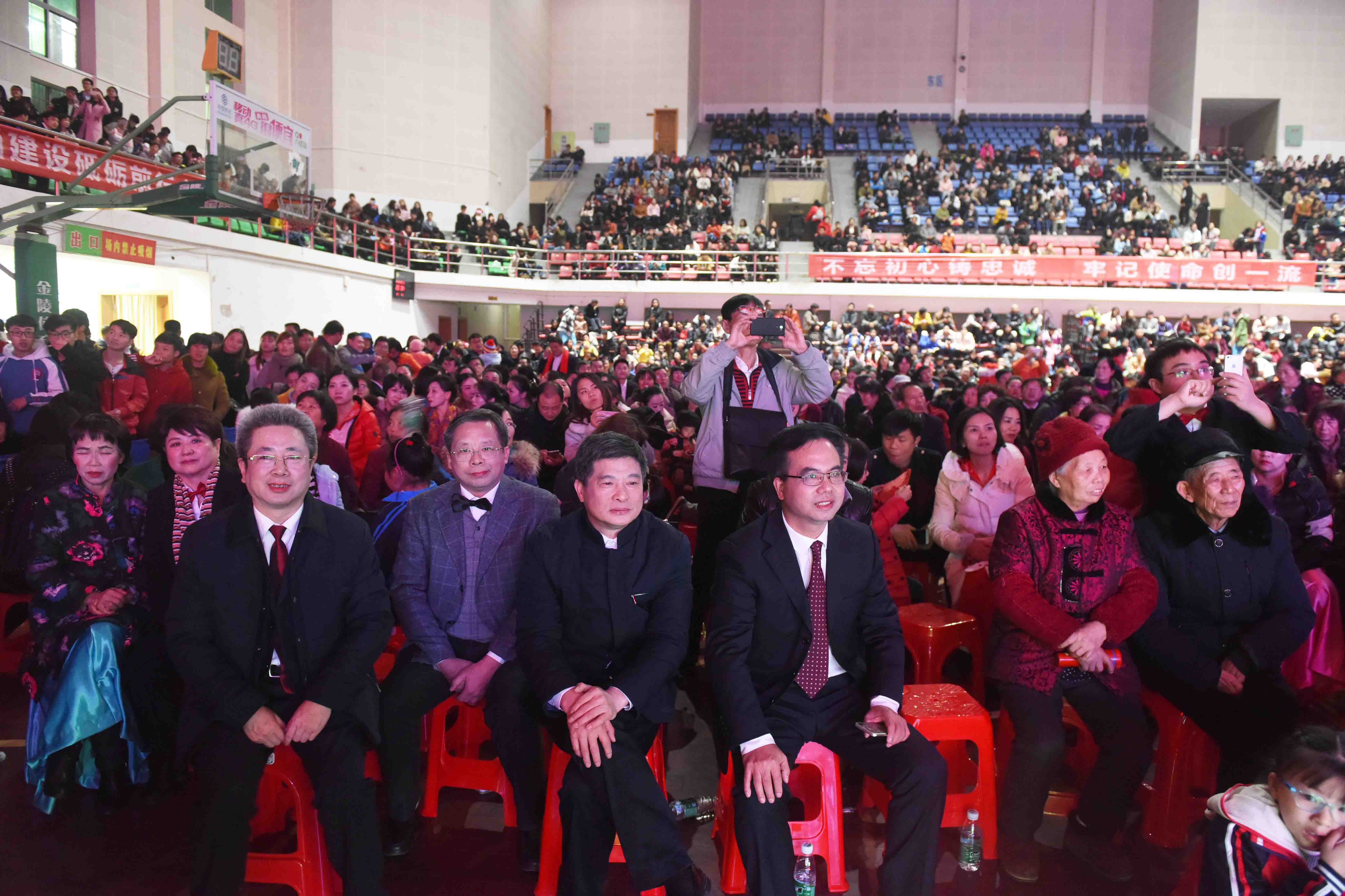 本网讯 12月29日,学校举办“唱响新时代 踏上新征程”迎新年晚会。当晚,体育馆外虽然寒意阵阵,晚会现场却是暖意融融,气氛温馨,其中一段暖人场景令人记忆深切:老同志们进场时,党委书记陈弘及其他校领导们同大家热情握手并主动将座位让给老同志,令老同志们感动不已。
