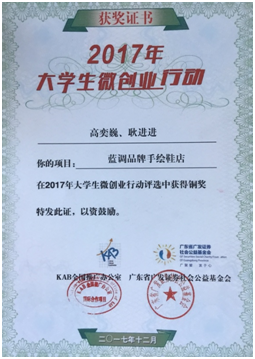 本网讯 1月6日,2017年大学生微创业行动成果发布会暨大学生微创业论坛在北京举办。我校人文与社会科学学院高奕巍团队的项目《蓝调品牌手绘鞋店》获得本次大赛铜奖、学校获大赛优秀组织奖,这是我校被确定为全国大学生KAB创业教育基地后首次荣获该奖。